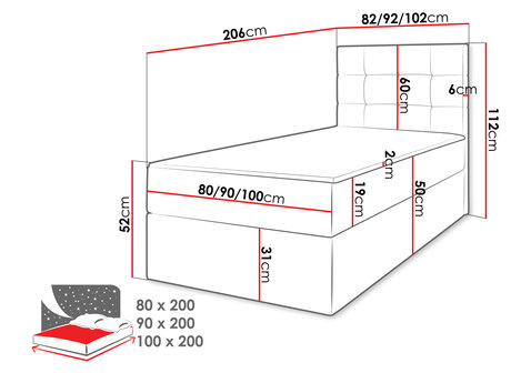 Kontinentalni jednostruki krevet idealan je izbor za one koji traže udobnost i stil. Mekano tapecirani kontinentalni krevet Cinema Single udoban je komad namještaja za svakodnevno spavanje. Srednje tvrd glavni madrac osigurava udobnost tijekom noćenja. Opremljen površinskim topperom čini osnovu za siguran i bezbrižan san. Još jedna prednost namještaja je veliki spremnik. Unutar prostranog spremnika ima mjesta i za kovčeg i rezervne deke. Kontinentalni jednostruki krevet Cinema Single stilska je ponuda za opremanje modernog interijera. Neutralan stil pristaje i uz klasičan, loft ili npr. Dimenzije: 80: duljina: 206 cm, širina: 82 cm, visina: 112 cm, površina za spavanje: 80 x 200 cm, dimenzije spremnika: duljina: 197 cm, širina: 76 cm, visina 30 cm, 90: duljina: 206 cm, širina: 92 cm, visina: 112 cm, površina za spavanje: 90 x 200 cm, dimenzije spremnika: duljina: 197 cm, širina: 86 cm, visina 30 cm, 100: duljina: 206 cm, širina: 102 cm, visina: 112 cm, površina za spavanje: 100 x 200 cm, dimenzije spremnika: duljina: 197 cm, širina: 96 cm, visina 30 cm. Izvedba: okvir: laminirana ploča + drvo + letvice, naslon: 16 mm debela iverica + borove letvice + 2 cm debela pjena T21, ima spremnik - podizanje zahvaljujući plinskim podizačima, čime je rukovanje vrlo jednostavno i lagano, glavni madrac: bonell opruge + pjena T25, debljina 3 cm, stupanj tvrdoće glavnog madraca (srednji sloj kreveta): H3, sasvim gore - gornji sloj madraca (Mandula topper): srednje tvrd, debljina cca 2 cm, prošivena navlaka, topper izrađen od najkvalitetnijih hipoalergenskih materijala: antibakterijska i protugljivična poliesterska pletenina 200 gsm, PU pjena: odlikuje se visokom gustoćom, odgovarajućom tvrdoćom i elastičnošću, niskom sklonošću deformaciji, visokom udobnošću korištenja, visoko prozračna netkana tkanina 100 gsm izrađena od poliesterskog vlakna, 35 gsm umetak izrađen od visokokvalitetne netkane tkanine, poliestersko mikrovlakno 82 gsm: prozračno, visoka apsorpcija vlage, antialergijsko, pruža barijeru protiv prašine i grinja, topper ima 4 čvrste gumice za pričvršćivanje koje sprječavaju pomicanje madraca, rub: obrubljen trakom po obodu, obostrano - obje strane čine uporabnu površinu, madrac se preporučuje okretati svaka 2-3 mjeseca, periv na 30˚C. Crne plastične noge, krevet nije samostojeći (stražnji dio presvučen crnim fibertexom). Jamstvo: 24 mjeseca.