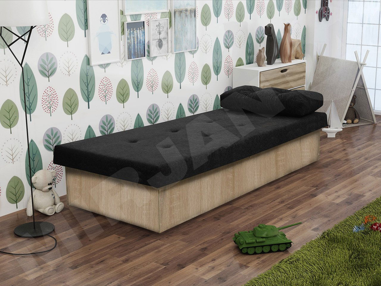baza kreveta: iveral debljine 16 mm, sjedalo u obliku Bonell, prostor za posteljinu kao dodatna opcija uz nadoplatu, jastuk vidljiv u aranžmanu nije uključen u cijenu kreveta – ukrasni element
