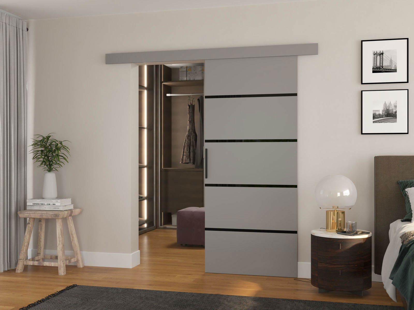 Moshoro klizna vrata kombiniraju eleganciju laminirane ploče s praktičnim kliznim sustavom. Crne ručke daju im moderan izgled.