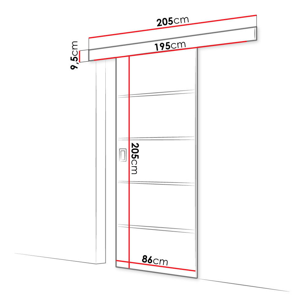 crne metalne ravne šipke, samo na jednoj strani vrata(montirajte samostalno prema uputama za montažu),crna plastična ručka (105 x 55 x 5 mm),mogućnost montaže na lijevu ili desnu stranu (univerzalna vrata),maska vodilice je samo sprijeda, bokovi nezaklonjeni,Klizni sustav s kugličnim ležajevima – metalni,krilo vrata klizi po vodilici montiranoj iznad otvora vrata ispod maske,maska prekriva zid 7,5 cm,u cijeni je samozatvarač koji sprječava udarce pri zatvaranju,stražnja strana vrata je glatka i bez umetaka.