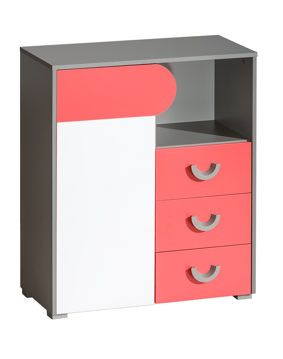 Komoda Flumo prikladna za dječje sobe. Izrada od laminiranih ploča s ABS rubovima.