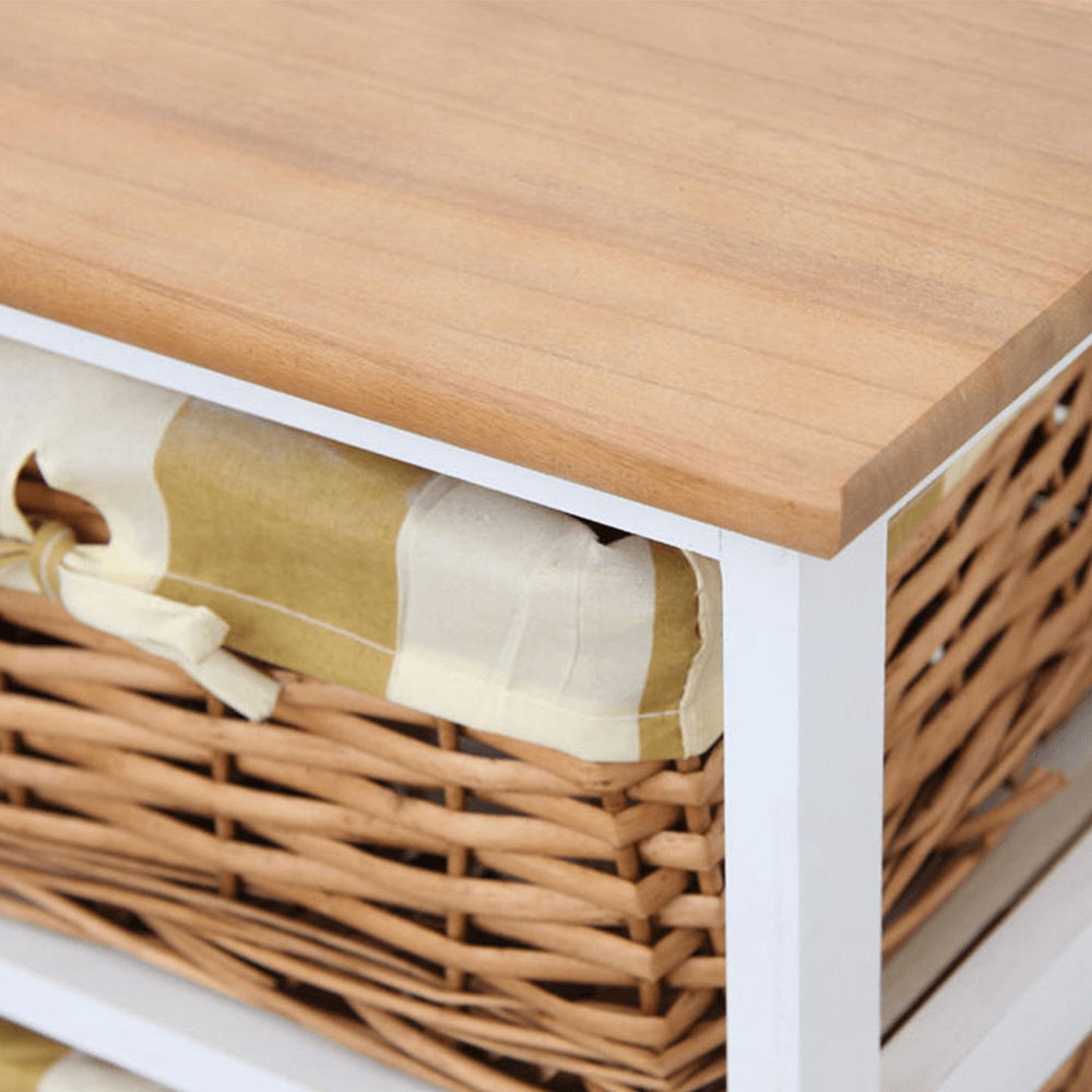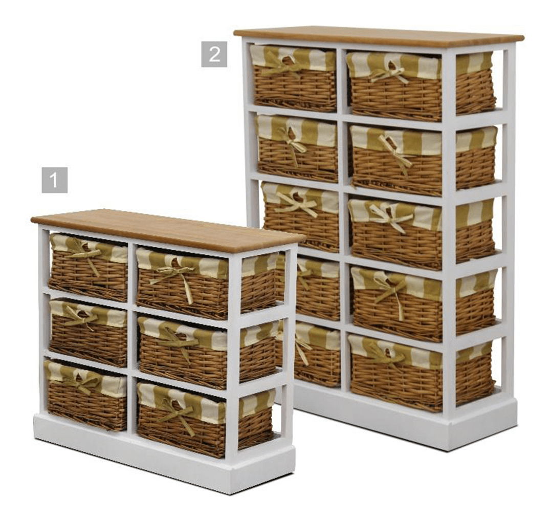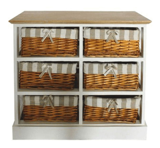 Lijepa komoda za ljubitelje prirodnih materijala i rustikalnog stila. Ima šest košara. U kombinaciji bijele boje i boje meda.