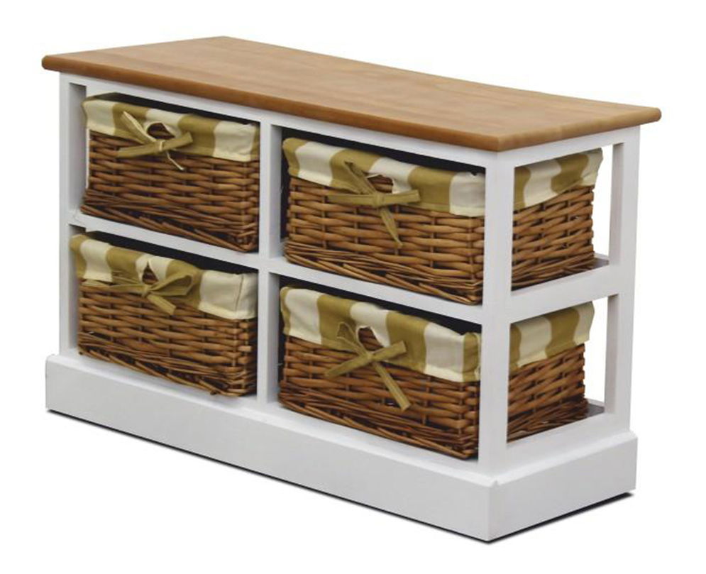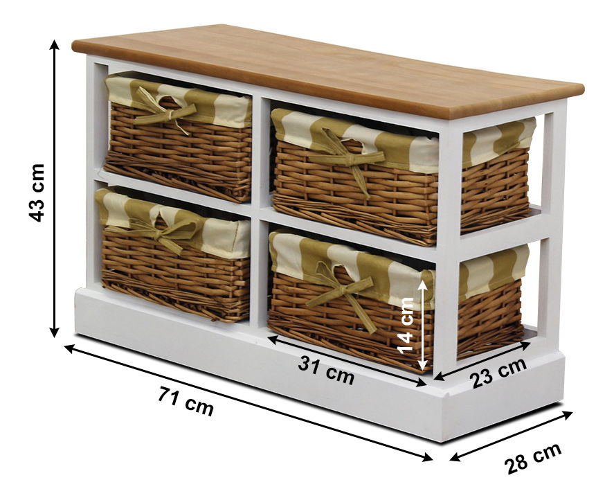 Lijepa komoda za ljubitelje prirodnih materijala i rustikalnog stila. Ima jednu košaru. U kombinaciji bijele boje i boje meda.