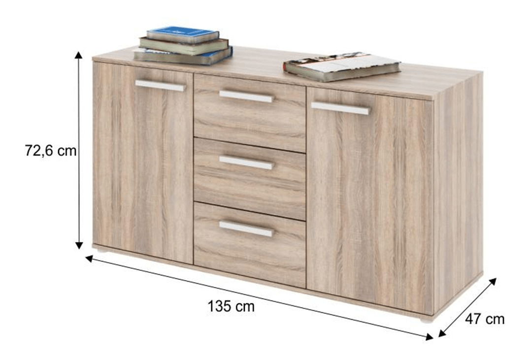 Komoda jednostavnog dizajna ima 2 vrata i 3 ladice. U boji hrast sonoma.