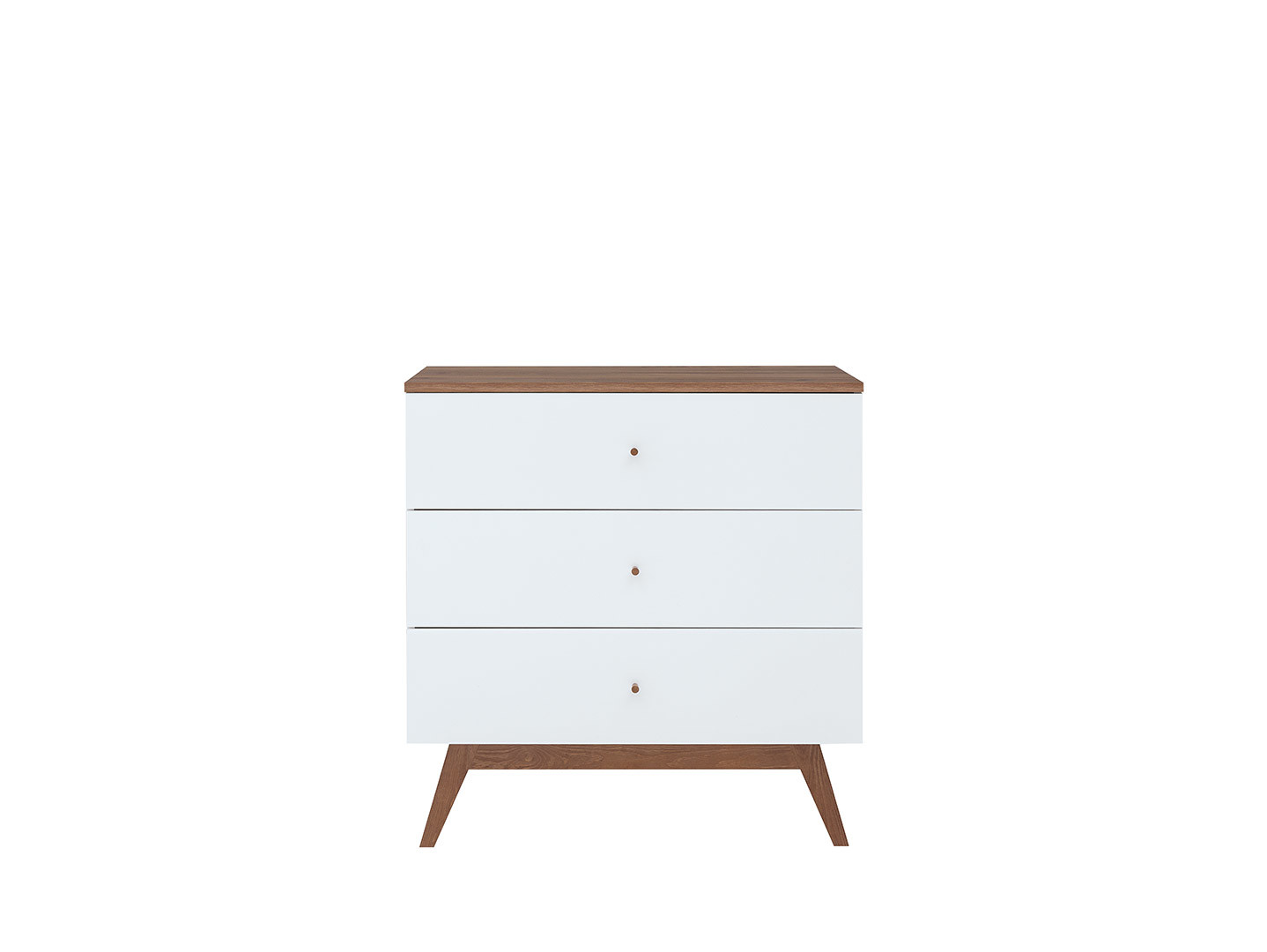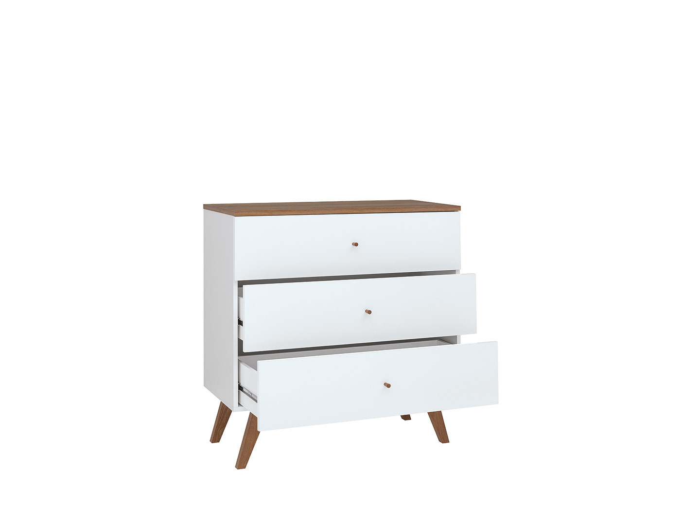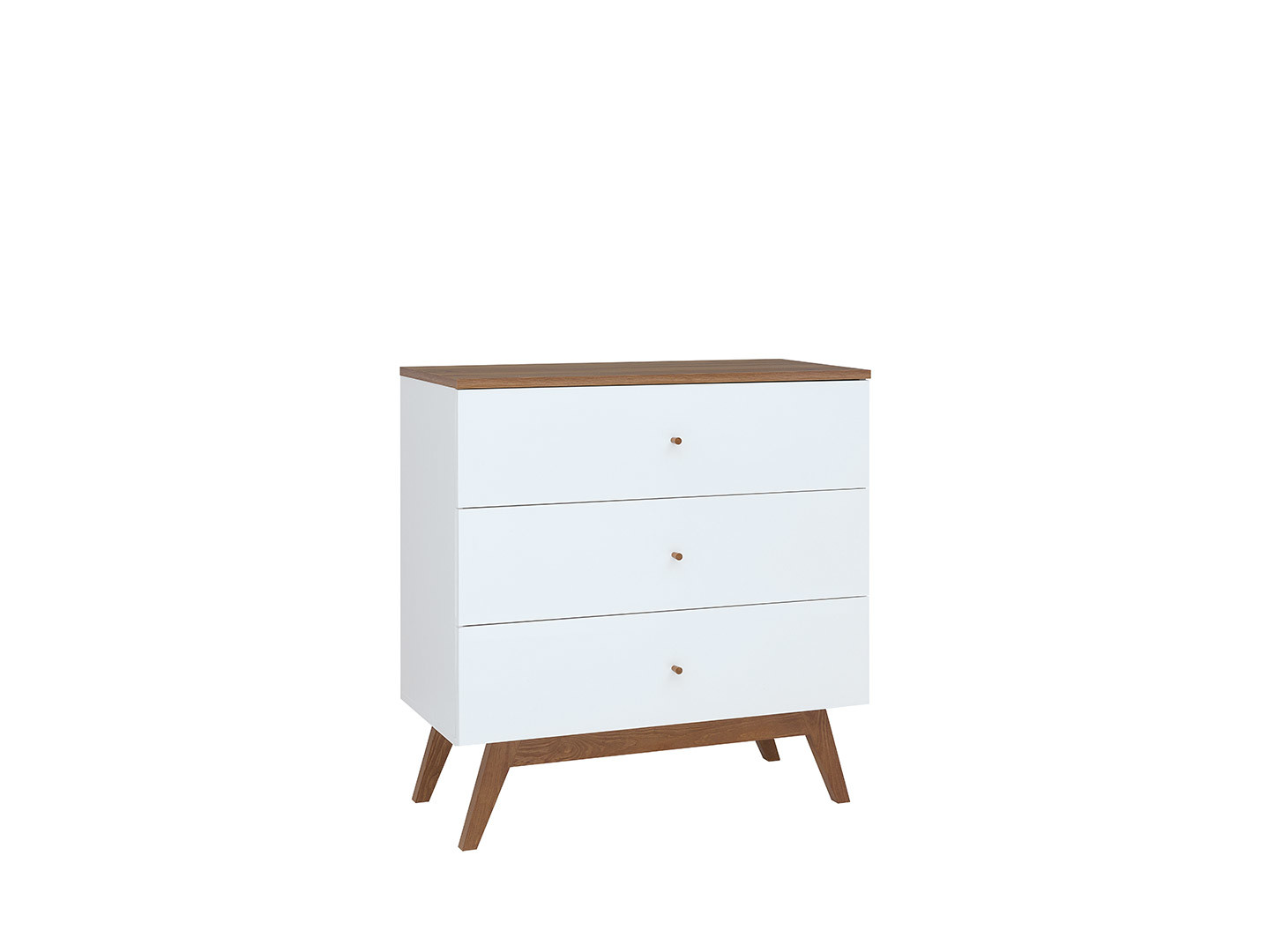 Kamo s odjećom, dodatcima i sitnicama? Jednostavno ih odložite u ovu prekrasnu komodu s 3 ladice. Komoda ima drvene noge, a ladice metalne ručke.