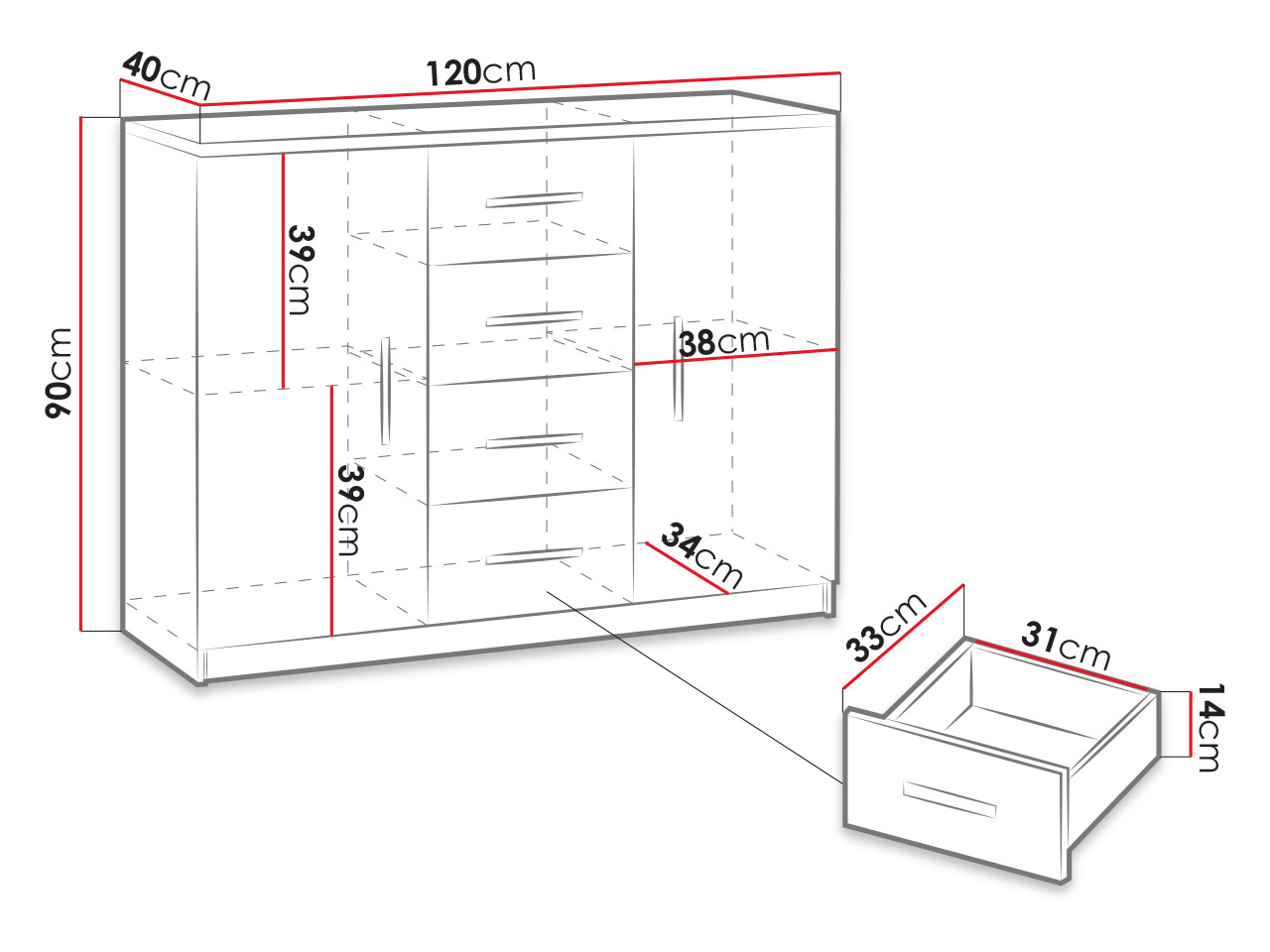 Komoda je idealan izbor za one koji traže udobnost i stil. Moderna komoda Kler K2D4SZ KE01 je više od praktičnog komada namještaja za dnevni boravak, spavaću sobu ili hodnik. Privlači jednostavnim i ugodnim dizajnom i unosi atmosferu sklada i mira u prostoriju. Stilska i elegantna komoda ima mnogo praktičnih prostora za pohranu. Za manje dodatke u središtu komode nalazi se niz prostranih ladica. Dimenzije: širina: 120 cm, visina: 90 cm, dubina: 40 cm. Boje: mogućnost izbora boja ovdje. Izrađeno: gornja ploča debljine 22 mm, korpus ploča 16 mm, dodatak u prednjem dijelu: 12 mm, u ladicama su vodilice s kugličnim ležajevima, ručke – plastične, korpus izrađen od iverice debljine 16 mm, gornja ploča stola debljine 22 mm, umetci u vratima debljine 12 mm, valjkaste vodilice u ladicama, plastične ručke, ABS obruba. Dimenzije proizvoda navedene su u centimetrima i mogu se razlikovati od stvarnih dimenzija za ± 3 cm. Dimenzije namještaja ne mijenjamo na zahtjev kupaca. Jamstvo: 24 mjeseca.