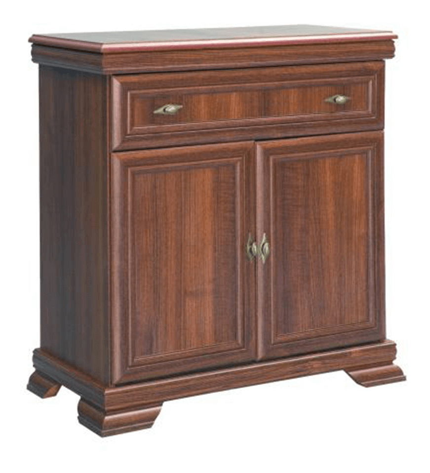 Rustikalna komoda Kraz s ladicom i vratima. Isporučuje se u tamnoj boji Samoa king. Ladica i vrata imaju metalne ručke.