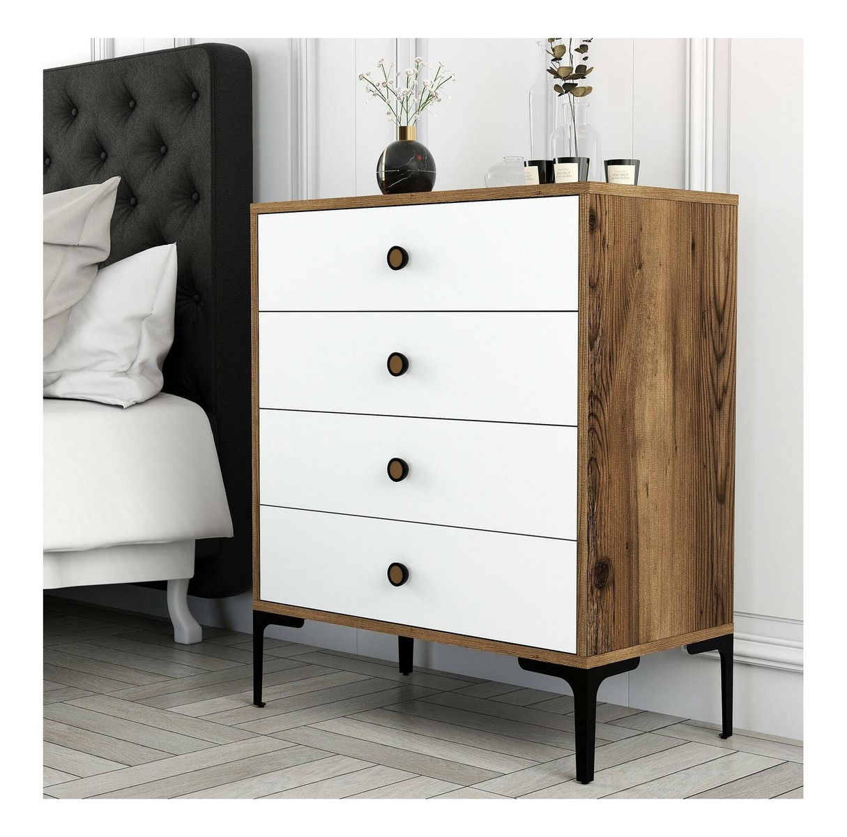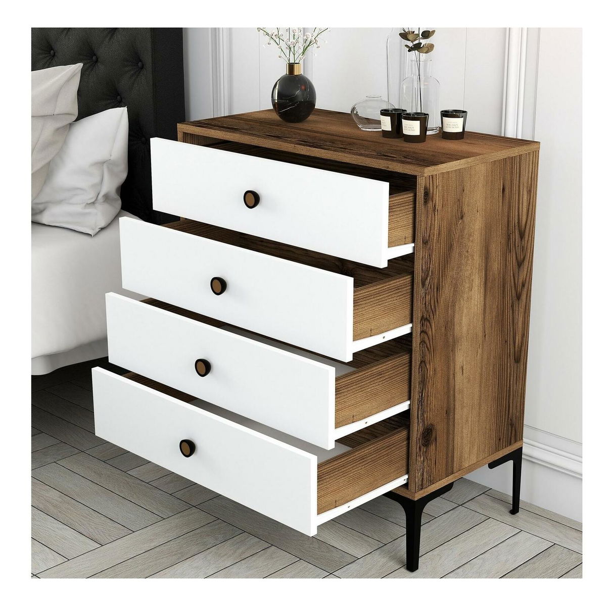 debljina: 18 mm, plastične ručke metalne noge, komoda veličina: širina: 76 cm, visina: 90,7 cm, dubina: 40 cm, 4 ladice visina nogu: 17,8 cm