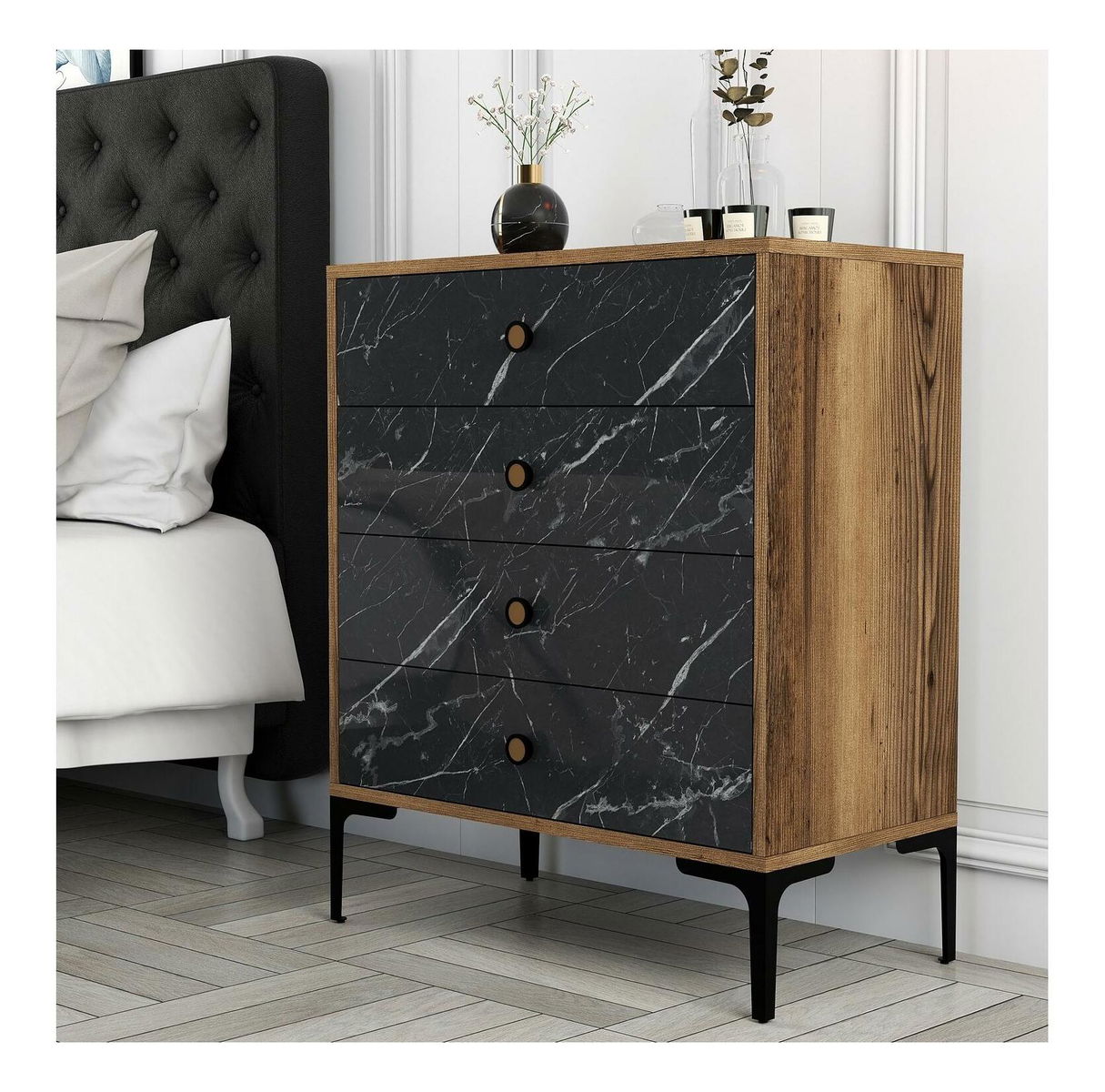 debljina: 18 mm, plastične ručke metalne noge, komoda veličina: širina: 76 cm, visina: 90,7 cm, dubina: 40 cm, 4 ladice visina nogu: 17,8 cm
