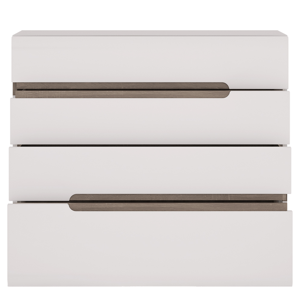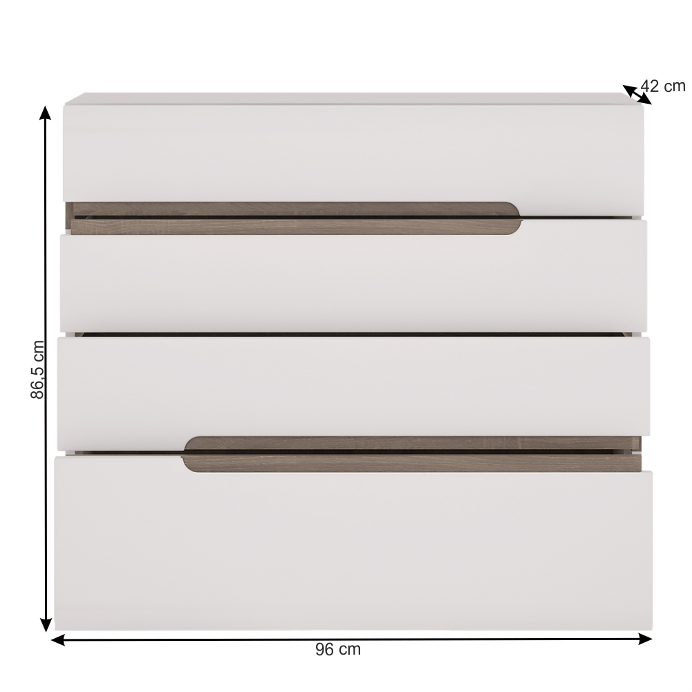 Komoda s 4 ladice sjajne bijele boje i pruga u nijansi hrast sonoma tartuf.
