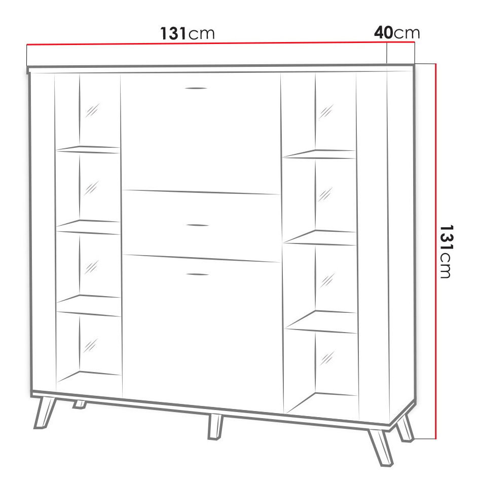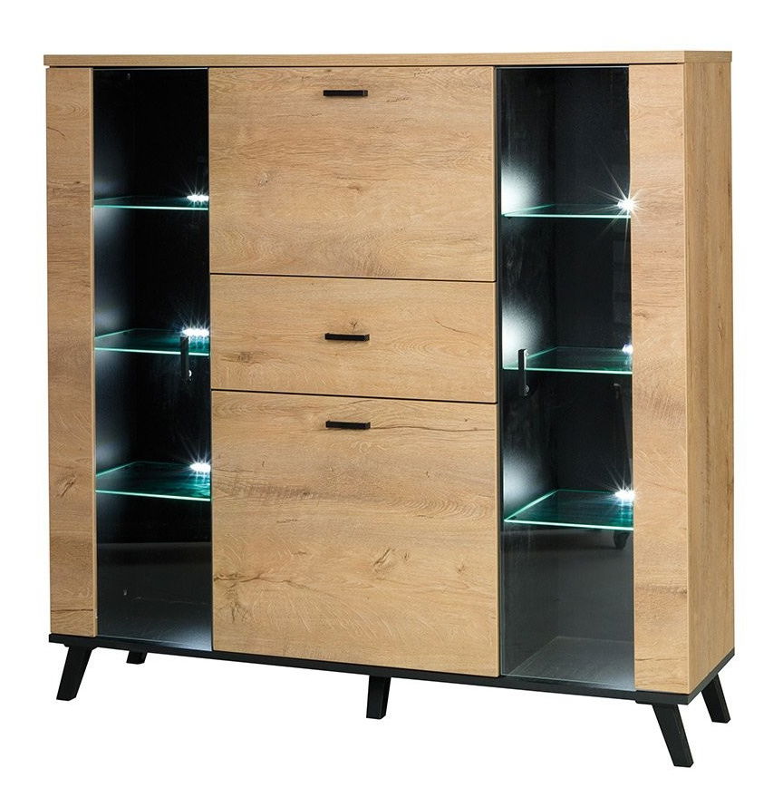 Komoda je idealan izbor za one koji traže udobnost i stil. Komoda Mallorca 4D1S ML03 odlikuje se upečatljivim dizajnom. Komoda s industrijskim prizvukom kombinira laminiranu ploču u boji prirodnog drva s crnim elementima u obliku ručki i visokih nogica. Komoda Mallorca savršeno pristaje u dnevni boravak ili blagovaonicu, jer ima djelomično ostakljenu frontu i unutra staklene police. Na njih možete izložiti čaše, posuđe ili dekoracije. Police se mogu osvijetliti LED rasvjetom. Osim ostakljenih ormarića, komoda nudi i ladice te bar ormarić. Dimenzije: širina: 131 cm, visina: 131 cm, dubina: 40 cm. Boje: moguće odabrati gore. Izvedba: laminirana ploča, gornja ploča: laminirana ploča debljine 22 mm, boja: hrast (unutrašnjost) i crna (središnji dio), gornje ploče i fronte presvučene ABS rubom, plastične ručke i nogice, noge visine 12 cm, staklene fronte, unutra staklene police, vodilice GTV, kuglični ležajevi H-35, puni izvlačaj, uz nadoplatu: LED rasvjeta (bijela). Dimenzije proizvoda navedene su u centimetrima i mogu odstupati od stvarnih za ± 3 cm. Dimenzije namještaja ne mijenjamo na zahtjev kupaca. Jamstvo: 24 mjeseca.