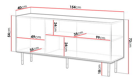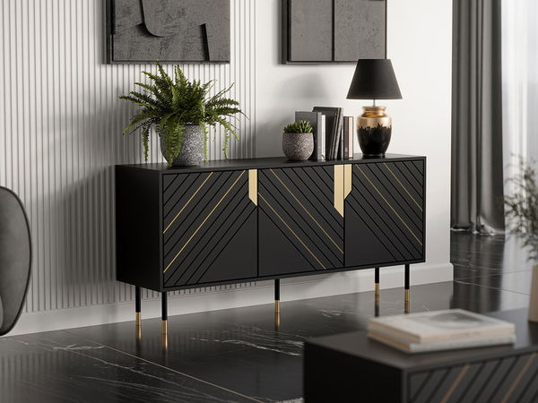 Komoda je idealan izbor za one koji traže udobnost i stil. Komoda za dnevni boravak Maramax 150 3D je jedinstveni dekorativni element. Njezinu prednju stranu krase zlatni detalji koji u kombinaciji s metalnim nogama u crno-zlatnoj izvedbi daju cijelom komadu sofisticiran karakter. Ovaj dizajn savršeno će se uklopiti u moderan, elegantan prostor dnevnog boravka. Korištenje komode je jednostavno i ugodno zahvaljujući sustavu otvaranja „PUSH TO OPEN“. Tri prostrana ormarića bit će savršena za pohranu raznih predmeta. Svoje mjesto ovdje će pronaći odjeća, dodaci i kućanske sitnice. Dimenzije: širina: 154 cm, visina: 72 cm, dubina: 40 cm. Izvedba: korpus: laminirana ploča debljine 16 mm, fronte: 16 mm mat crna MDF + zlatni urezani lakirani elementi, stražnji dio namještaja od HDF ploče, rubovi: ABS, šarke FI35, noge: metal u crnoj i zlatnoj boji, visine 18 cm, bez ručki, sustav otvaranja "PUSH TO OPEN". Dimenzije proizvoda navedene su u centimetrima i mogu se razlikovati od stvarnih za ± 3 cm. Dimenzije namještaja ne mijenjamo na zahtjev kupca. Jamstvo: 24 mjeseca.