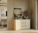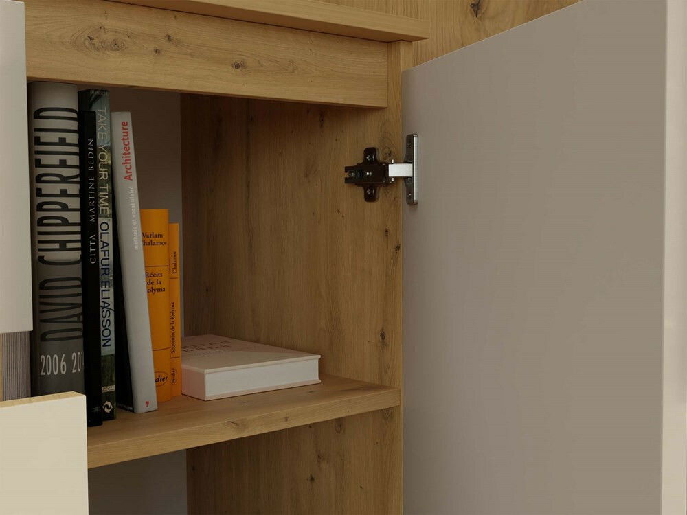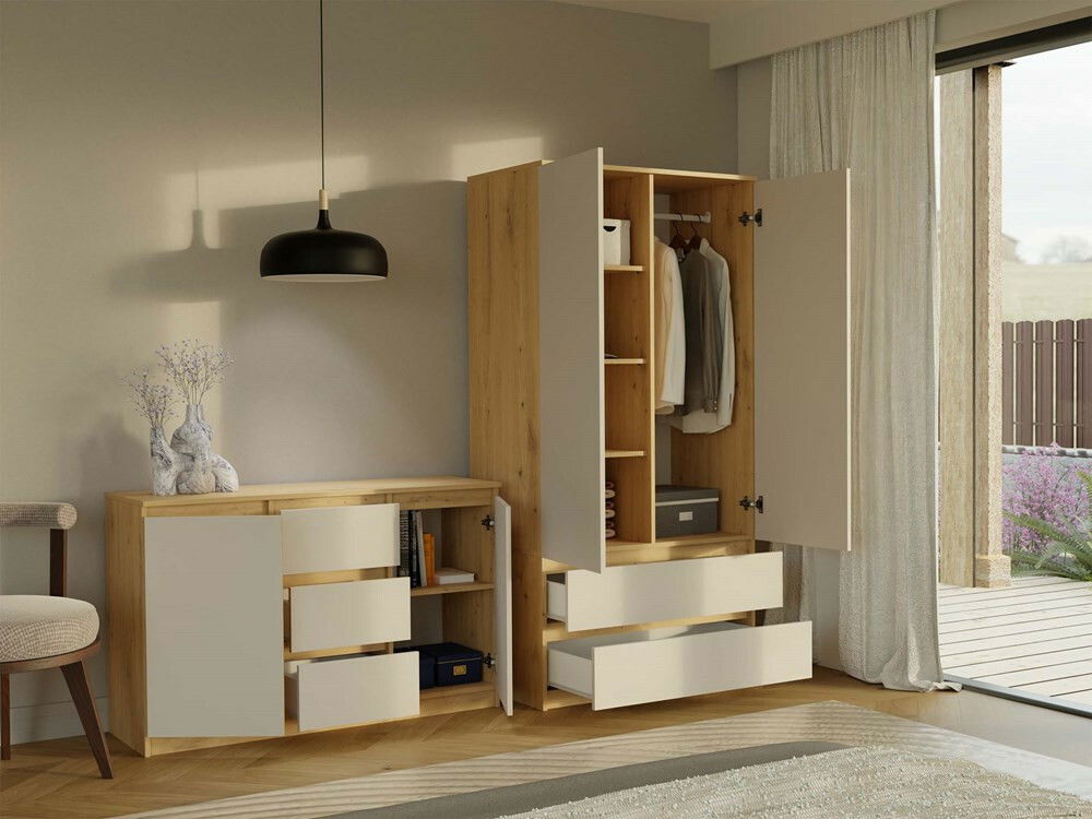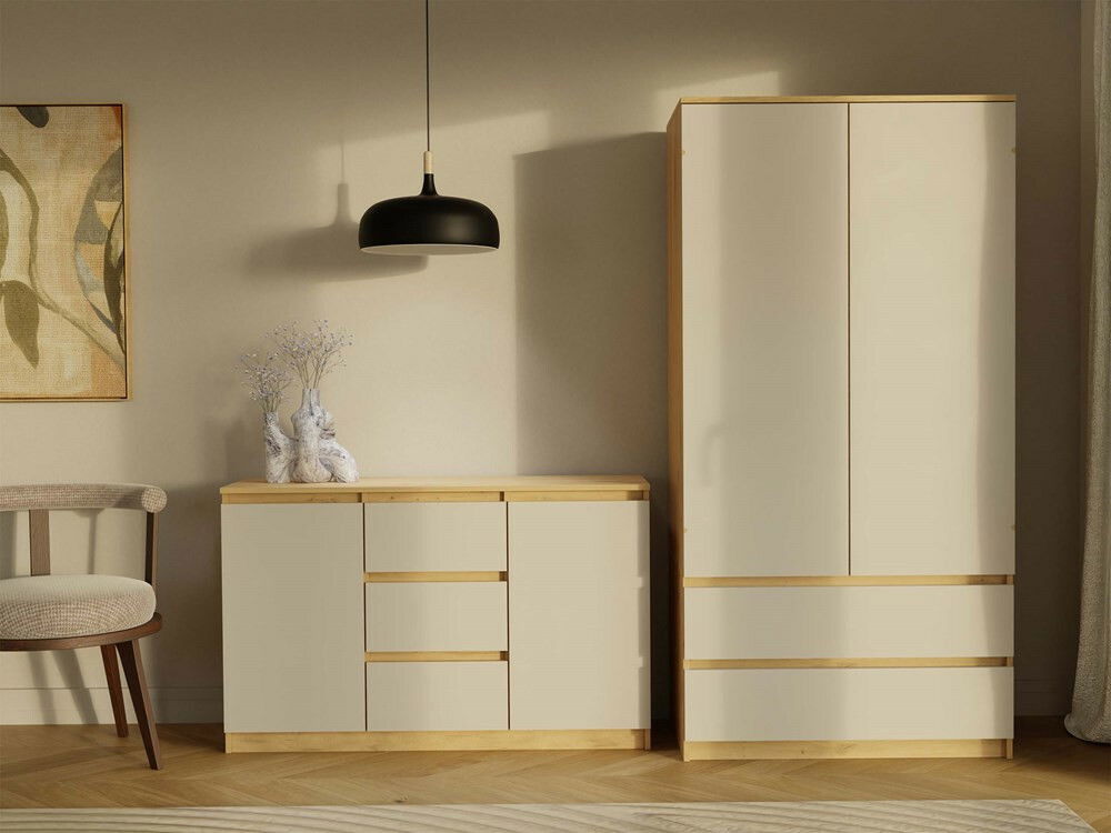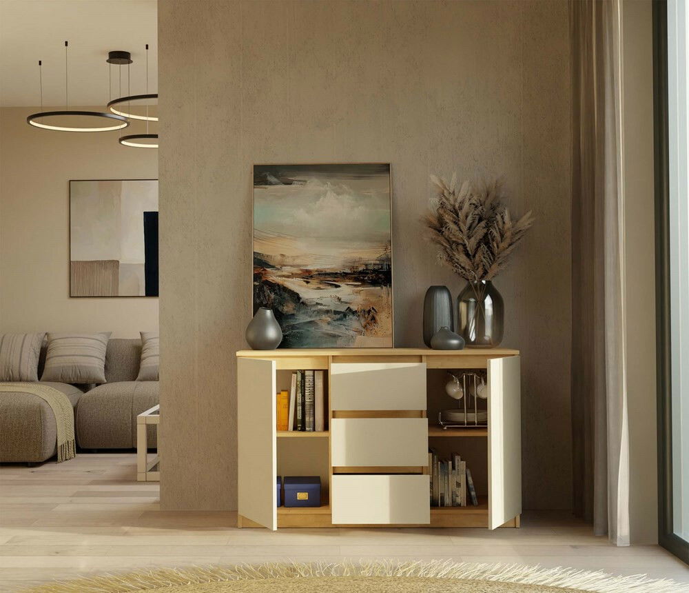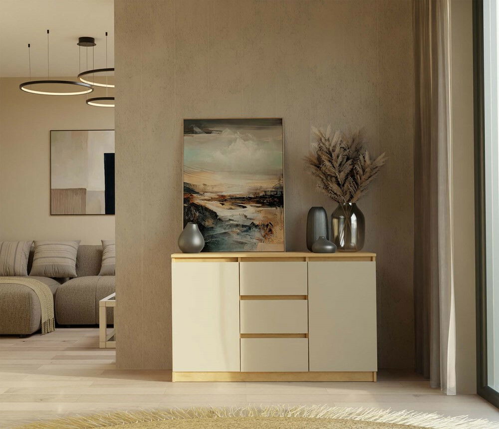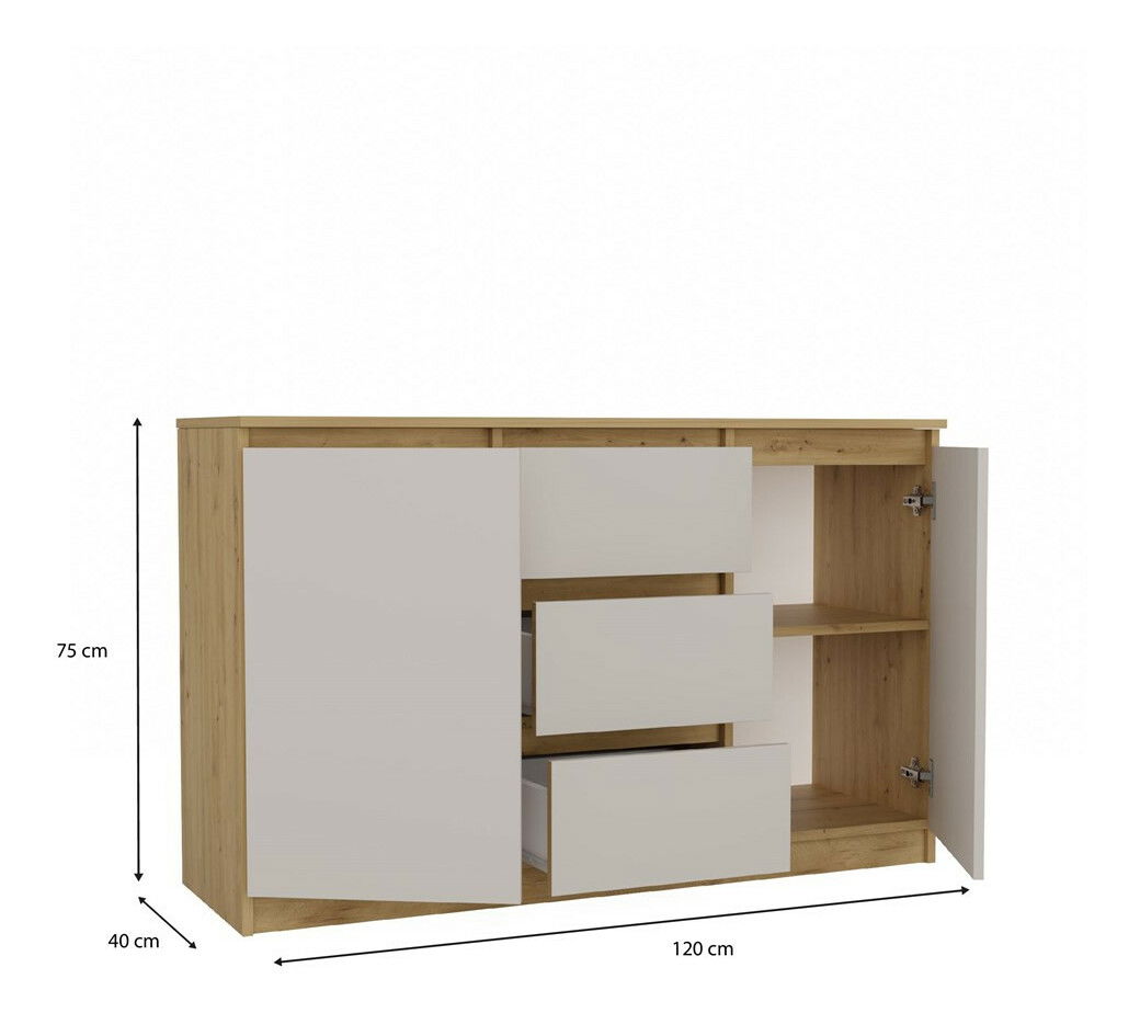Komoda Musecalo 11 moderan je i elegantan komad namještaja koji se savršeno uklapa u srce vašeg doma, bilo u spavaću sobu, dnevni boravak ili dječju sobu. S dimenzijama 120 cm širine i 75 cm visine nudi dovoljno prostora za pohranu zahvaljujući dvoja vrata i tri prostrane ladice koje su postavljene na kvalitetne valjkaste vodilice za glatko otvaranje. Kombinacija boja hrasta artisan i kašmira daje komodi bezvremenski izgled koji se skladno uklapa u različite stilove interijera. Ovaj komad namještaja nije samo funkcionalan, već i estetski privlačan, čime obogaćuje vaš dom.