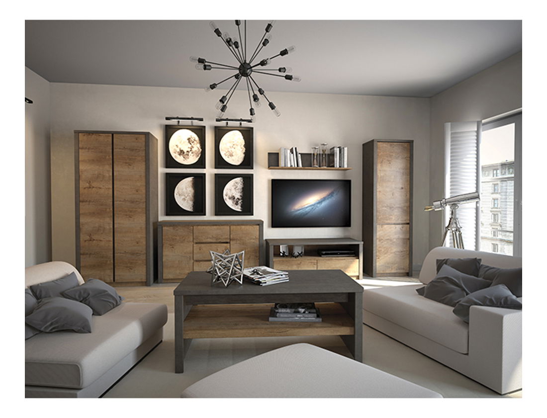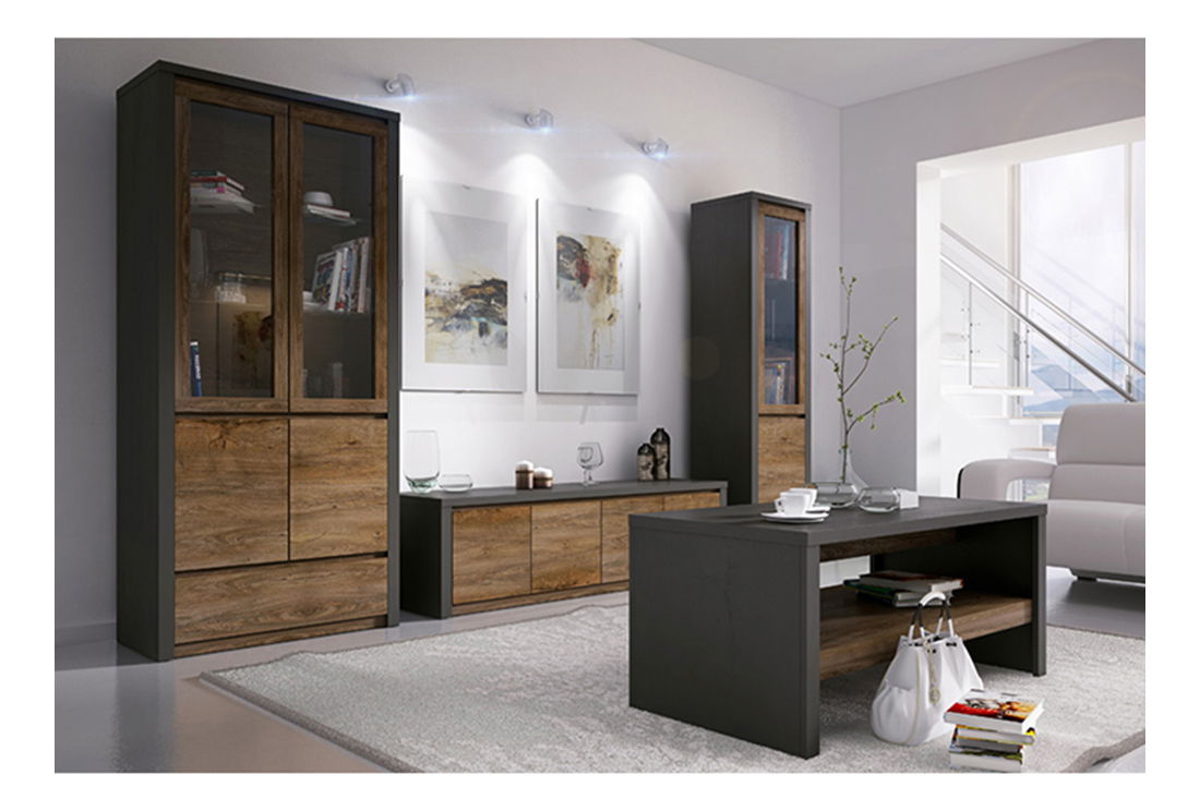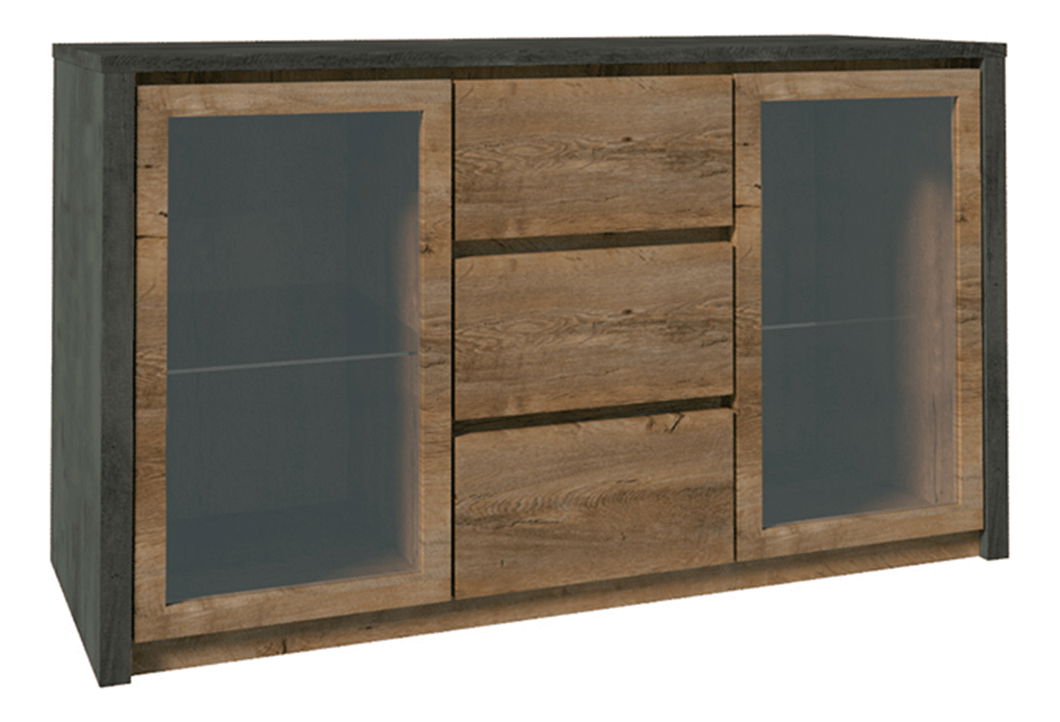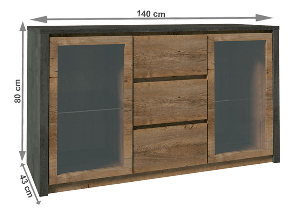 Komoda 130 Modestus ima staklena vrata. Iza njih naći ćete policu. U srednjem dijelu se nalaze tri ladice.