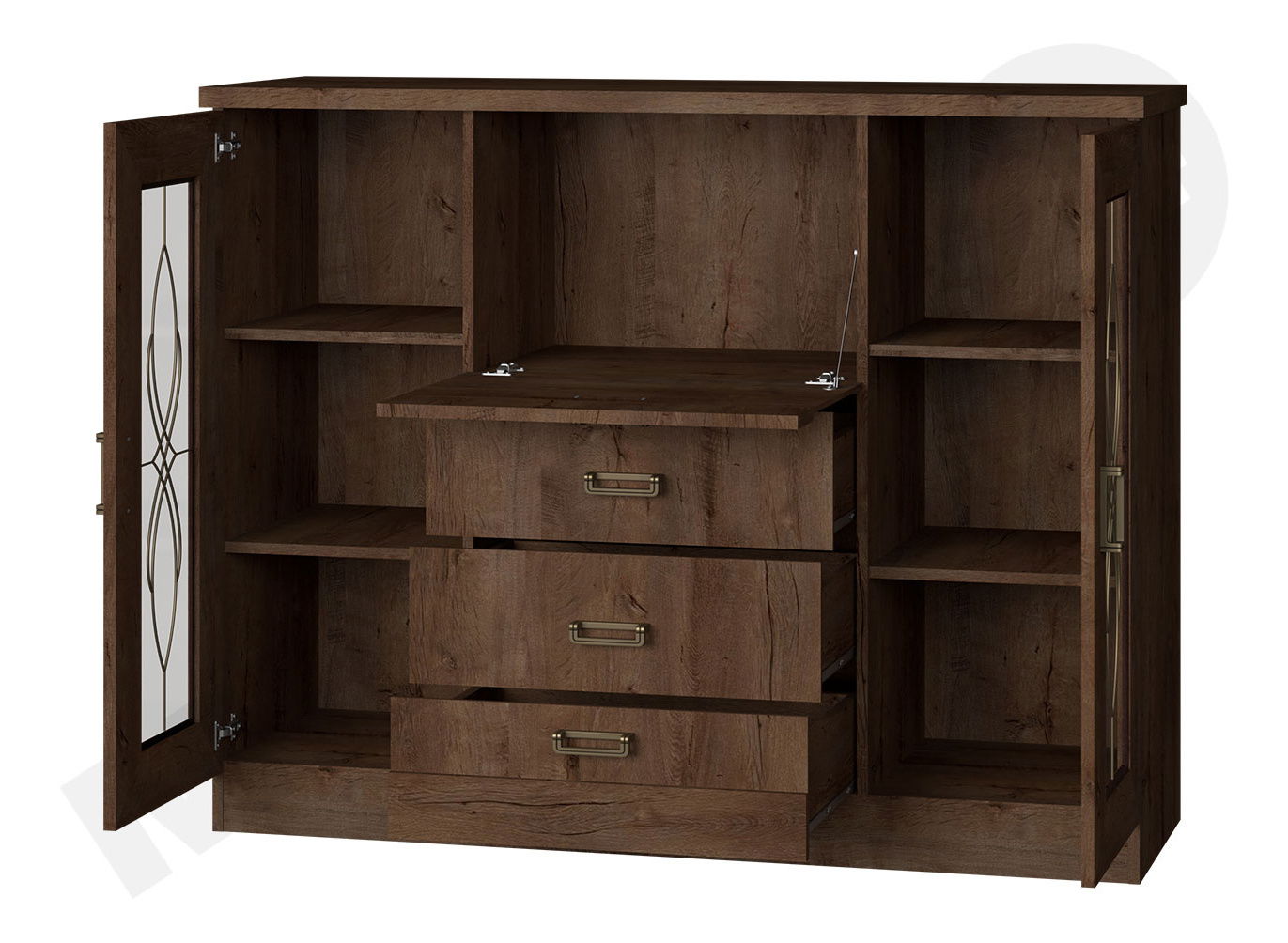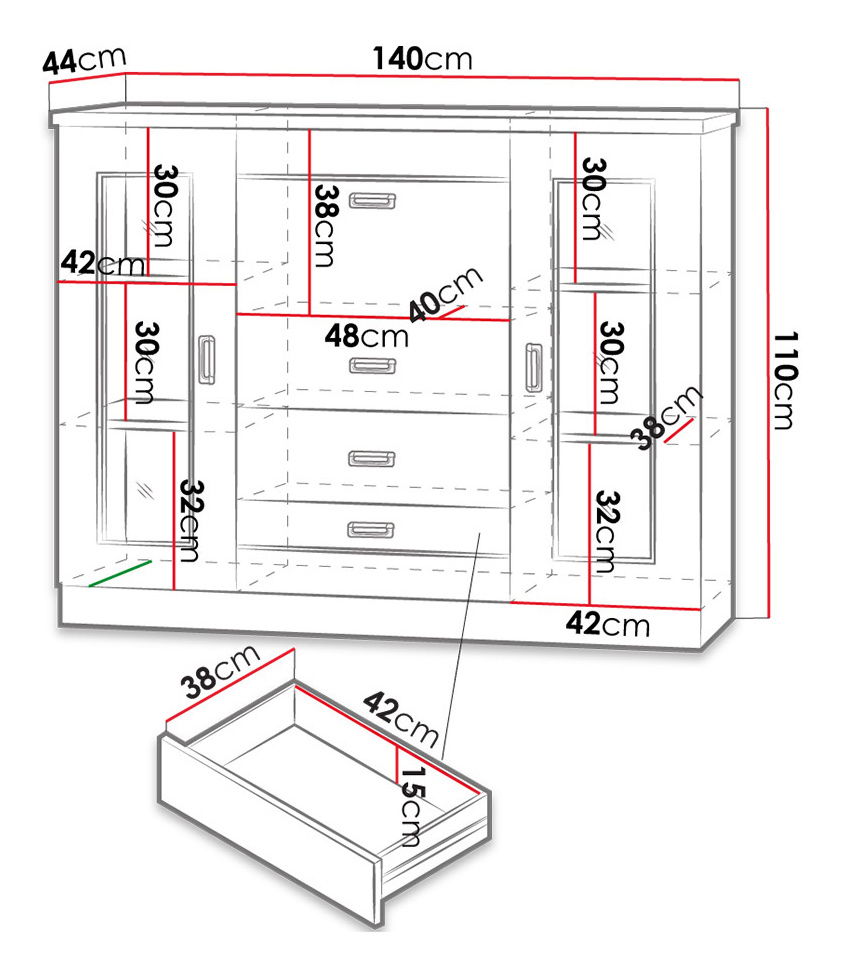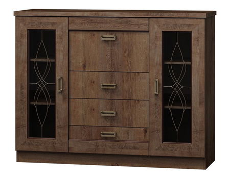 Ostakljena komoda je idealan izbor za one koji traže udobnost i stil. Želite li u dnevnoj sobi spoj praktične i oku ugodne opreme? Upravo takva je ostakljena komoda Noris N14. U ostakljenim dijelovima izložit ćete svoju malu zbirku porculanskih figurica ili osvojenih trofeja, dok ćete u ladici spremiti recimo blagdanski pribor ili posuđe. Dimenzije: širina: 140 cm, visina: 110 cm, dubina: 44 cm. Boja: odaberite dostupnu boju ovdje. Dodatne informacije: LTD (16 mm), ploča do 32 mm, zaštitni PVC rub (2 mm), letvice na vratima: MDF, ručke: metal, bez nogica, valjkaste vodilice, police: iverica, ukrasni ornamenti zalijepljeni na komodu. Dimenzije proizvoda navedene su u centimetrima i mogu se razlikovati od stvarnih za ± 3 cm. Dimenzije namještaja ne mijenjamo na zahtjev kupca. Jamstvo: 24 mjeseca.