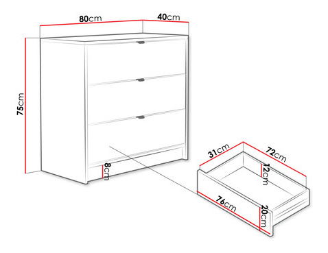 PrikazKomoda je idealan izbor za one koji traže udobnost i stil. Prostrana komoda s 3 ladice Razimo 3SZ pobrinut će se za funkcionalnost kućnog prostora za pohranu. Duboki spremnici vjerno nam služe za svakodnevnu upotrebu i pružaju praktičan prostor za sve vrste predmeta. Korištenjem prostora koji nude možemo osigurati red među stvarima u njima organiziranim. Još jedna prednost komode Razimo 3SZ je njezin atraktivan izgled. Za netipičan, ali istodobno skroman izgled zaslužne su utore na frontama. U kombinaciji s profinjenim ručkama daju komodi za rublje dašak avangarde i dobrog stila. Dimenzije: širina: 80 cm, visina: 75 cm, dubina: 40 cm. Izvedba: korpus: 16 mm debela laminirana ploča, fronte: 18 mm MDF ploča, rubovi: ABS i melamin, kuglični klizači, aluminijske ručke zlatne boje, nogice: crni klizači. Dimenzije proizvoda navedene su u centimetrima i mogu se razlikovati od stvarnih za ± 3 cm. Dimenzije namještaja ne mijenjamo na zahtjev kupca. Jamstvo: 24 mjeseca.