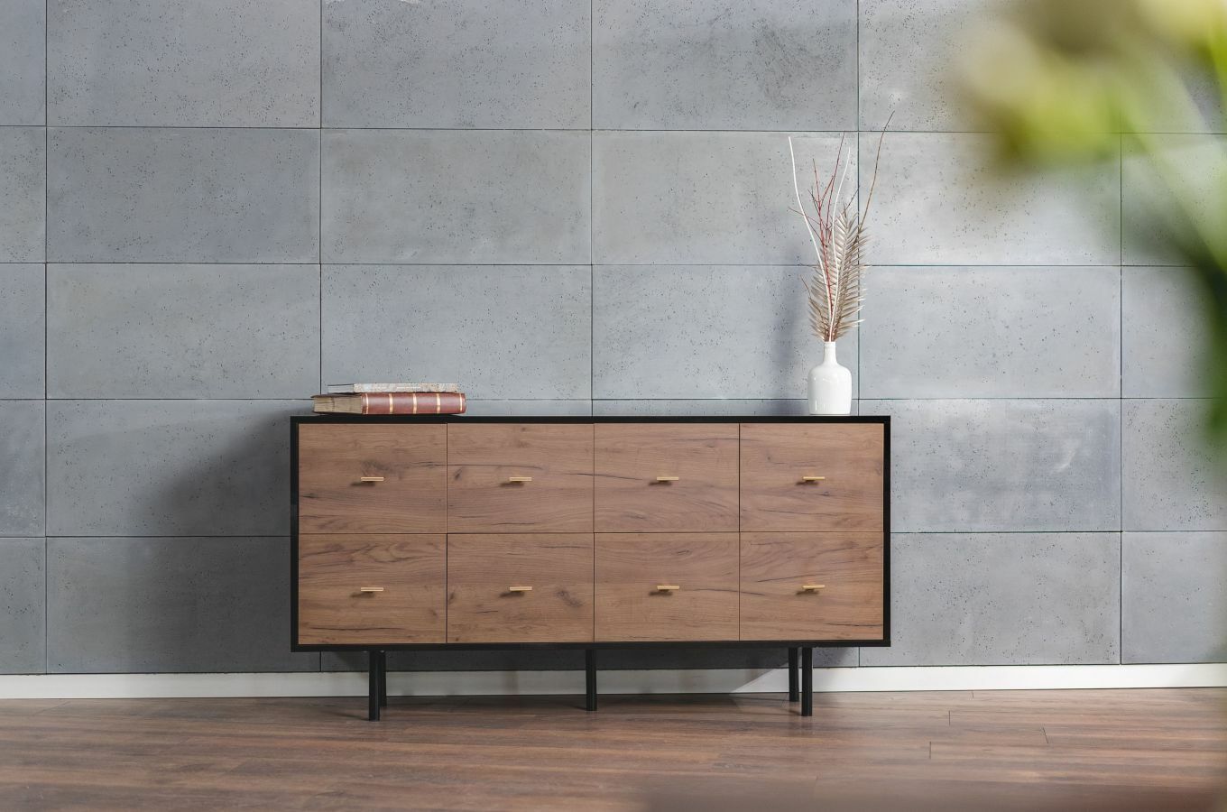 Moderna, bezvremenska Spinel komoda s osam ladica. Cijenit ćete i visoke metalne noge koje olakšavaju čišćenje ispod komode.
