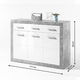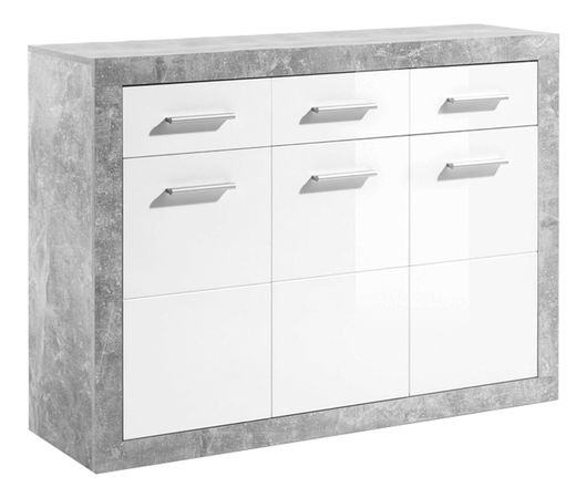Komoda s upečatljivim okvirom sive boje i prednjim frontama bijele boje. Komoda ima 3 ladice i 3 vrata.
