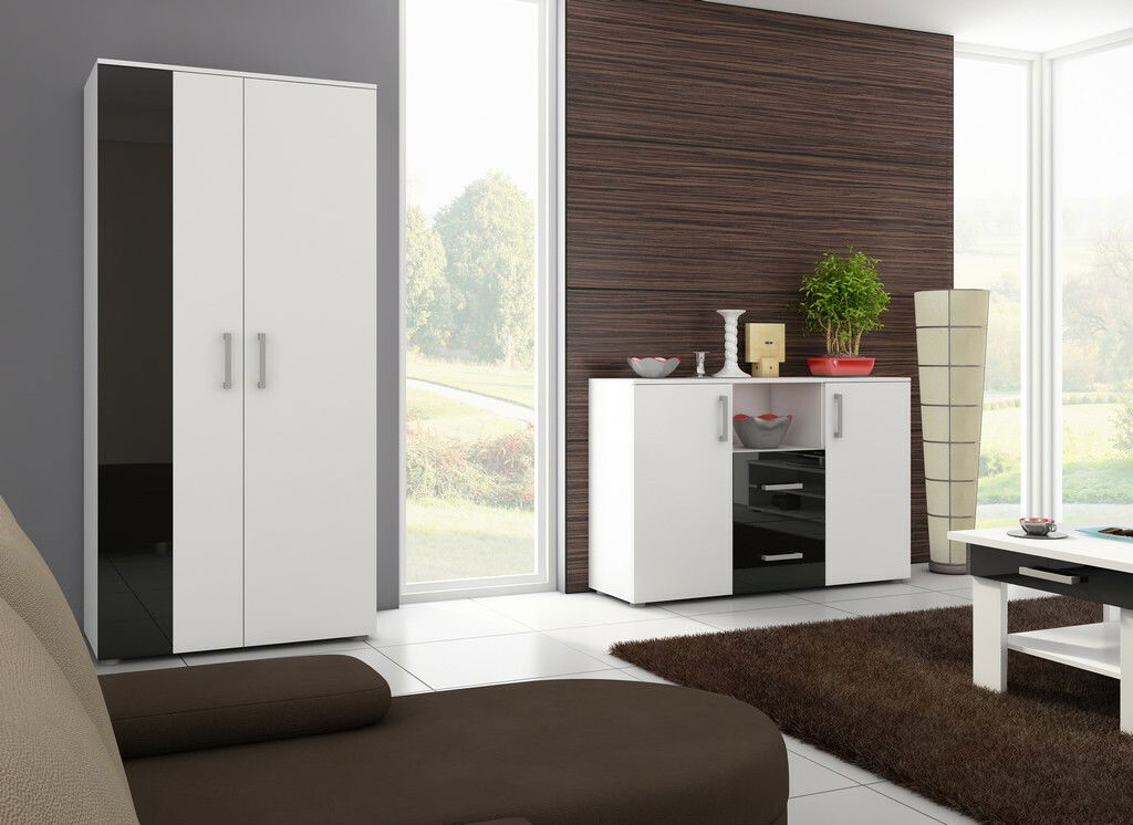 Praktična komoda s policama i ladicama. Prikazana komoda je bijele boje sa sjajnim crnim elementima. Uz nju možete naručiti prostran ormar iz iste linije namještaja.