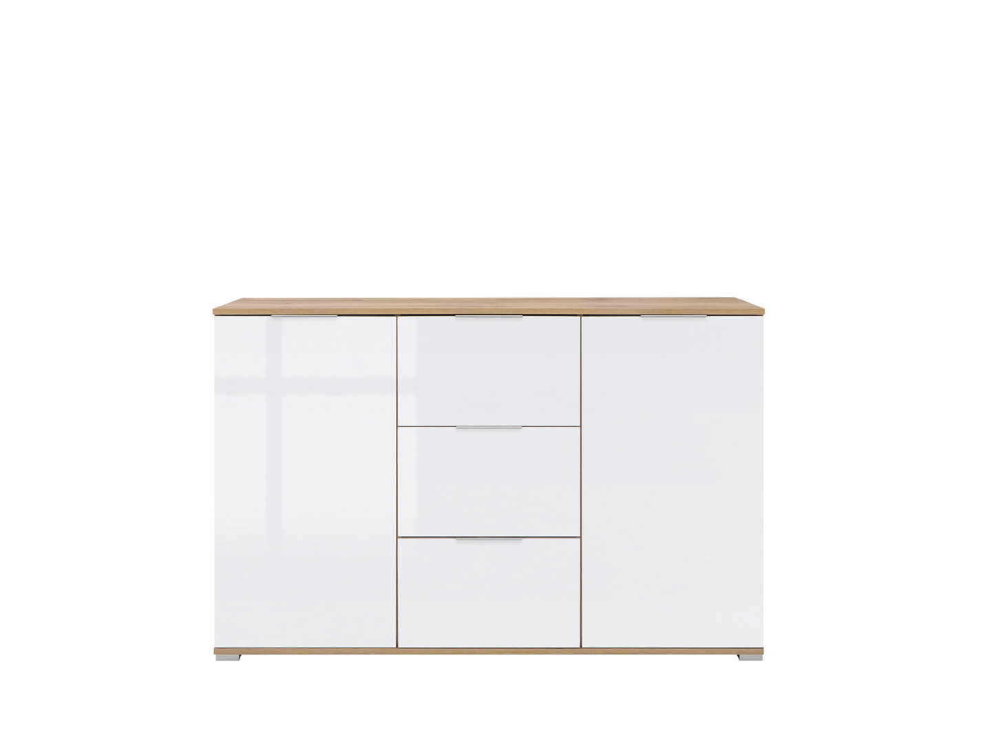 Osigurajte puno prostora za pohranu s ovom lijepo dizajniranom komodom koja će vaš dom pretvoriti u moderan i udoban prostor. Komoda se sastoji od 2 bočna ormarića i 3 ladice. Svaki ormar ima unutra po jednu policu nosivosti 4 kg. Vrata i ladice imaju tanje duguljaste ručke.