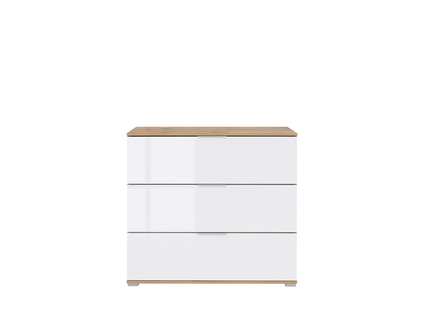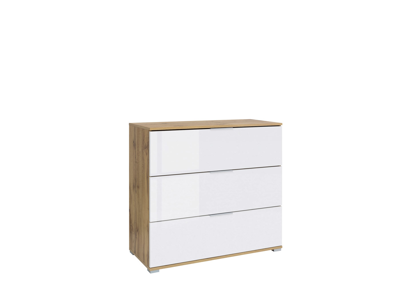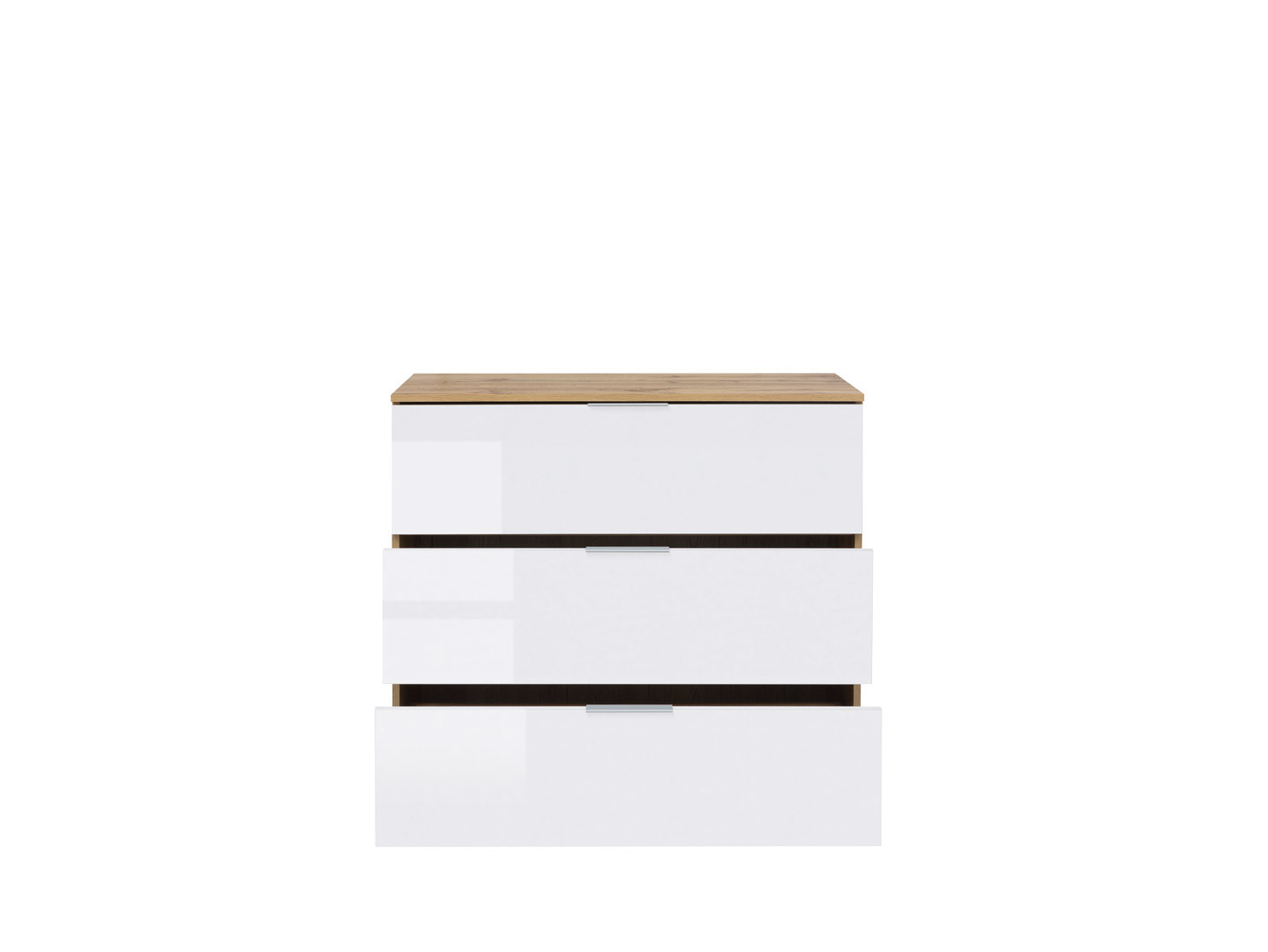 Trebate li prostor za rublje, odjeću i ostale potrepštine? Metalna komoda s tri ladice postat će omiljeni dodatak vašoj spavaćoj sobi, dnevnom boravku ili hodniku. Ugodan dizajn boje wotan hrasta u kombinaciji s bijelim sjajem i raznovrsnim dizajnom uklapa se u svaki interijer. Ladice imaju duguljaste ručke. Minimalističke linije naglašavaju karakter namještaja koji će stvoriti savršenu kućnu atmosferu. Svaka ladica ima maksimalnu nosivost do 4 kilograma.