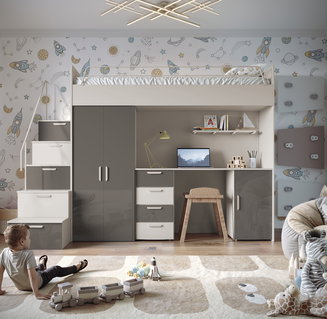 Ako imate malo prostora, obratite pažnju na skladišne površine kreveta ili odaberite krevet na kat ispod kojeg se nalazi radni kutak s PC stolom ili ormarićima. Do kreveta vode ljestve ili mini stepenice koje se mogu koristiti i kao komoda. Takav sustav je prikladan za jedno dijete prije svega školarca. Na taj način će mu se stvoriti prostor i za učenje i za igru.
