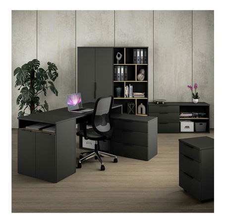 Radna soba Alegre 1 u modernoj kombinaciji antracita i hrasta cremona nudi stilski i praktičan prostor za produktivan rad. PC stol Alegre osigurava udobnost tijekom rada, dok uredski ormarić u antracit boji pruža potreban prostor za pohranu. Polični ormar, ormarić i tri regala Alegre s drvenim akcentima u dekoru hrasta cremona daju prostoru elegantan karakter i omogućuju preglednu i ukusnu organizaciju dokumenata ili knjiga.