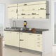 Kuhinja izrađena od MDF ploče. Korpus ormarića je sive boje, a donji ormarići su u krem boji visokog sjaja. Debljina radne ploče je 28 mm. Širina kuhinje je 260 cm.