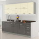 Kuhinja izrađena od MDF ploče. Donji kuhinjski ormarići se isporučuju s radnom pločom. Ormarić za sudoper se isporučuje bez radne ploče. Debljina radne ploče je 28 mm. Širina gornjeg i donjeg dijela kuhinje je 260 cm.