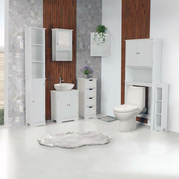 Kupaonica Athea 1 u elegantnoj bijeloj boji unosi u vaš prostor svježinu i čistoću. Praktični ormarić ispod umivaonika i viseći ormarić učinkovito pohranjuju sve potrebne stvari, dok visoki ormar sa policama i stilska komoda nude izdašan prostor za pohranu. Regal i kutna polica pametno iskorištavaju prostor i daju kupaonici prozračnost. Cijeli set stvara harmonično okruženje koje će uljepšati vašu svakodnevnu rutinu njege.
