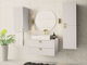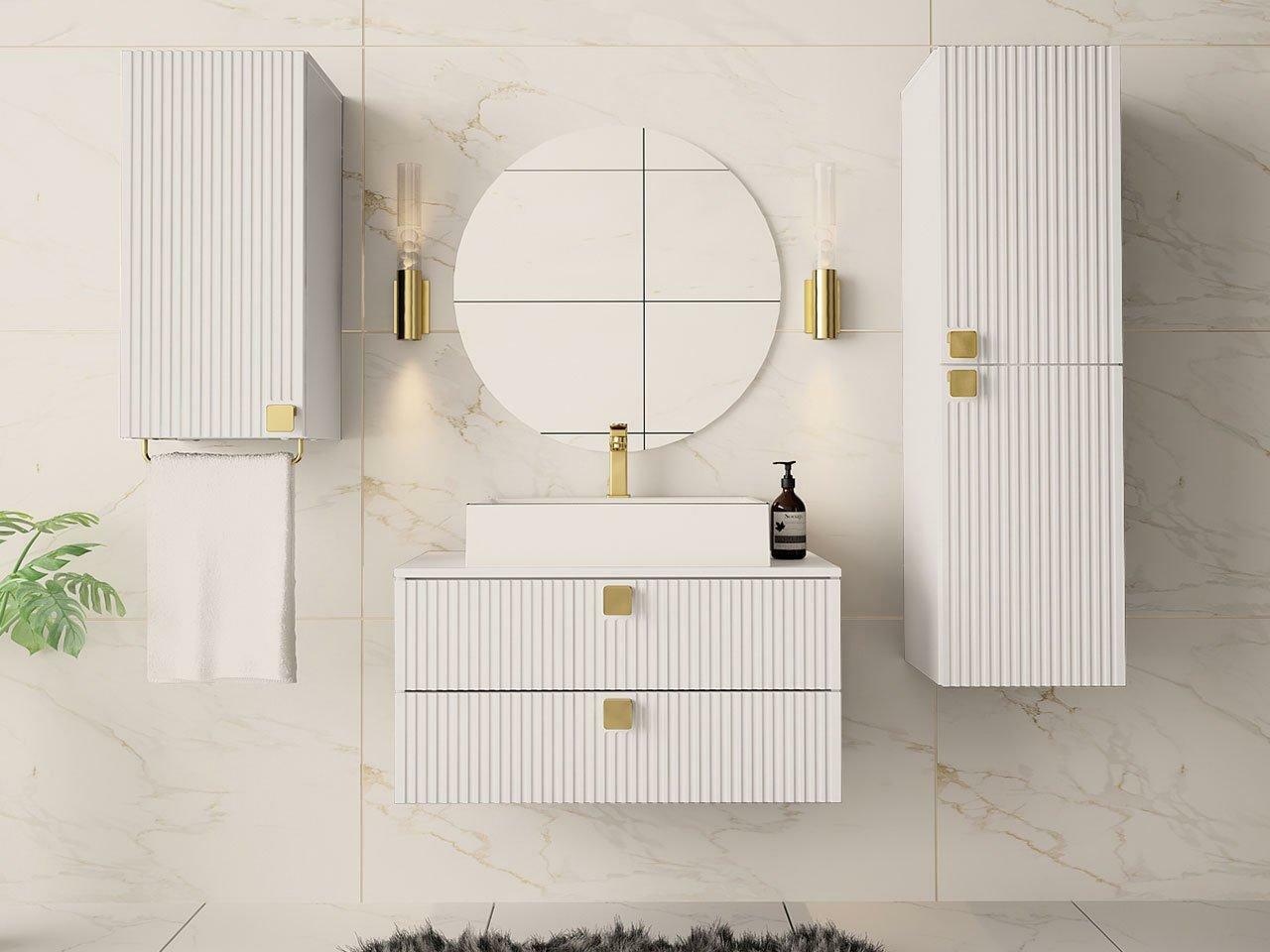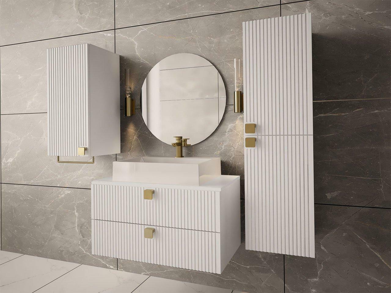 kupaonskim namještajem možete urediti lijepu i praktičnu kupaonicu u glamur stilu. Zahvaljujući uzdužnom glodanju na frontama, namještaj dobiva originalan izgled. Zlatni elementi su dodatak koji namještaju daje eleganciju i jedinstven stil. Moderni kupaonski namještaj nije samo dizajnersko, već i funkcionalno rješenje. Unutrašnjost prostranih ormara pruža vam mogućnost odlaganja potrebnih dodataka, kozmetike ili kućanskih potrepština. Kupaonski namještaj je funkcionalan, estetski i elegantan, što ga čini idealnim rješenjem za svaku ukusno uređenu kupaonicu.