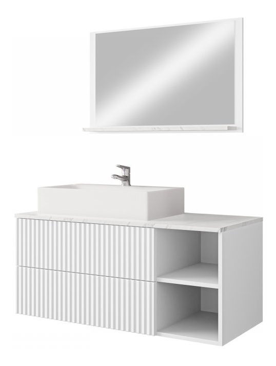 PrikazKupaonski set je idealan izbor za one koji traže udobnost i stil. Kupaonski namještaj Kiegi Ryfel I moderan je i stilski izbor. Elegantne brazde vidljive na prednjoj strani umivaoničkog ormarića u kombinaciji s mramornom pločom savršeno upotpunjuju prostor kupaonice. Rebrasti kupaonski namještaj ima promišljen dizajn. Zidni ormarić nudi dvije ladice i otvorene police. Tako osmišljen interijer omogućuje lak pristup spremljenoj kozmetici i dodacima. Dio seta visećeg kupaonskog namještaja je i ogledalo s policom. Skladni dizajn oba elementa savršeno se uklapa u moderan interijer. Dimenzije: Ogledalo Kiegi Ryfel: širina: 80 cm, visina: 50 cm, dubina: 12 cm. Ormarić ispod umivaonika Kiegi Ryfel: širina: 100 cm, visina: 45 cm, dubina: 45 cm. Umivaonik 550x420x115 (kao dodatna opcija uz nadoplatu): širina: 55 cm, visina: 12 cm, dubina: 42 cm. Izvedba: korpus: laminirana iverica debljine 16 mm, fronte: brazdasta MDF ploča, debljina 18 mm, ABS rub debljine 0,5 mm, stražnja strana izrađena od HDF ploče, donje montažne vodilice, bez ručki, sustav otvaranja "PUSH TO OPEN". Umivaonik uz nadoplatu, sifon uz nadoplatu, slavine prikazane na fotografiji nisu uključene u cijenu. Elementi u boji mramora izrađeni su od laminirane iverice debljine 16 mm. Jamstvo: 24 mjeseca.