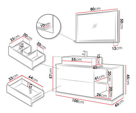 urezana MDF ploča, debljina 18 mm,ABS rub debljine 0,5 mm,stražnja strana izrađena od HDF ploče,donje montažne vodilice,bez ručki,sustav otvaranja "PUSH TO OPEN",umivaonik uz nadoplatu,sifon uz nadoplatu,slavina za umivaonik prikazana na fotografiji nije uključena u cijenu,elementi u mramornoj boji izrađeni su od laminirane iverice debljine 16 mm.