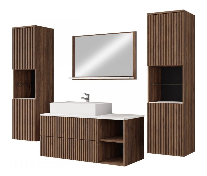 Kupaonski set idealan je izbor za one koji traže udobnost i stil. Pozovite utore u svoju kupaonicu! Set Kiegi Ryfel III naglašava elegantan i nadasve ugodan izgled interijera. Simetrični utori na frontama daju karakterističan izgled cijeloj prostoriji. Dodaju dašak modernosti i podižu atraktivnost uređenja. Prednosti velikog kupaonskog seta Kiegi Ryfel III uključuju funkcionalnost. Set je dizajniran tako da pruži maksimalan prostor za pohranu i nudi brojne pretince. U viseće ormariće možete posložiti veću kozmetiku, deterdžente i tekućine, dok će za ručnike i kućnu kemiju također biti dovoljno mjesta. Ormarić ispod umivaonika praktično je mjesto za često korištene dodatke. Dimenzije: ogledalo Kiegi Ryfel: širina: 80 cm, visina: 50 cm, dubina: 12 cm. Ormarić ispod umivaonika Kiegi Ryfel: širina: 100 cm, visina: 45 cm, dubina: 45 cm. Viseći ormarić Kiegi Ryfel 2x: širina: 35 cm, visina: 133 cm, dubina: 34 cm. Umivaonik 550x420x115 (dodatna opcija uz nadoplatu): širina: 55 cm, visina: 12 cm, dubina: 42 cm. Izvedba: korpus – laminirana iverica debljine 16 mm, fronte – utorna MDF ploča debljine 18 mm, ABS rub debljine 0,5 mm, stražnja strana od HDF ploče, polica – kaljeno staklo debljine 4 mm (stup), viseći ormarić univerzalan – prilikom montaže kupac odabire smjer otvaranja fronti (lijevo/desno), donje vodilice, panti s tihim zatvaranjem, bez ručki, otvaranje „PUSH TO OPEN“, umivaonik uz nadoplatu, sifon uz nadoplatu, slavine prikazane na slici nisu uključene u cijenu, dijelovi u boji mramora izrađeni su od laminirane iverice debljine 16 mm. Jamstvo: 24 mjeseca.