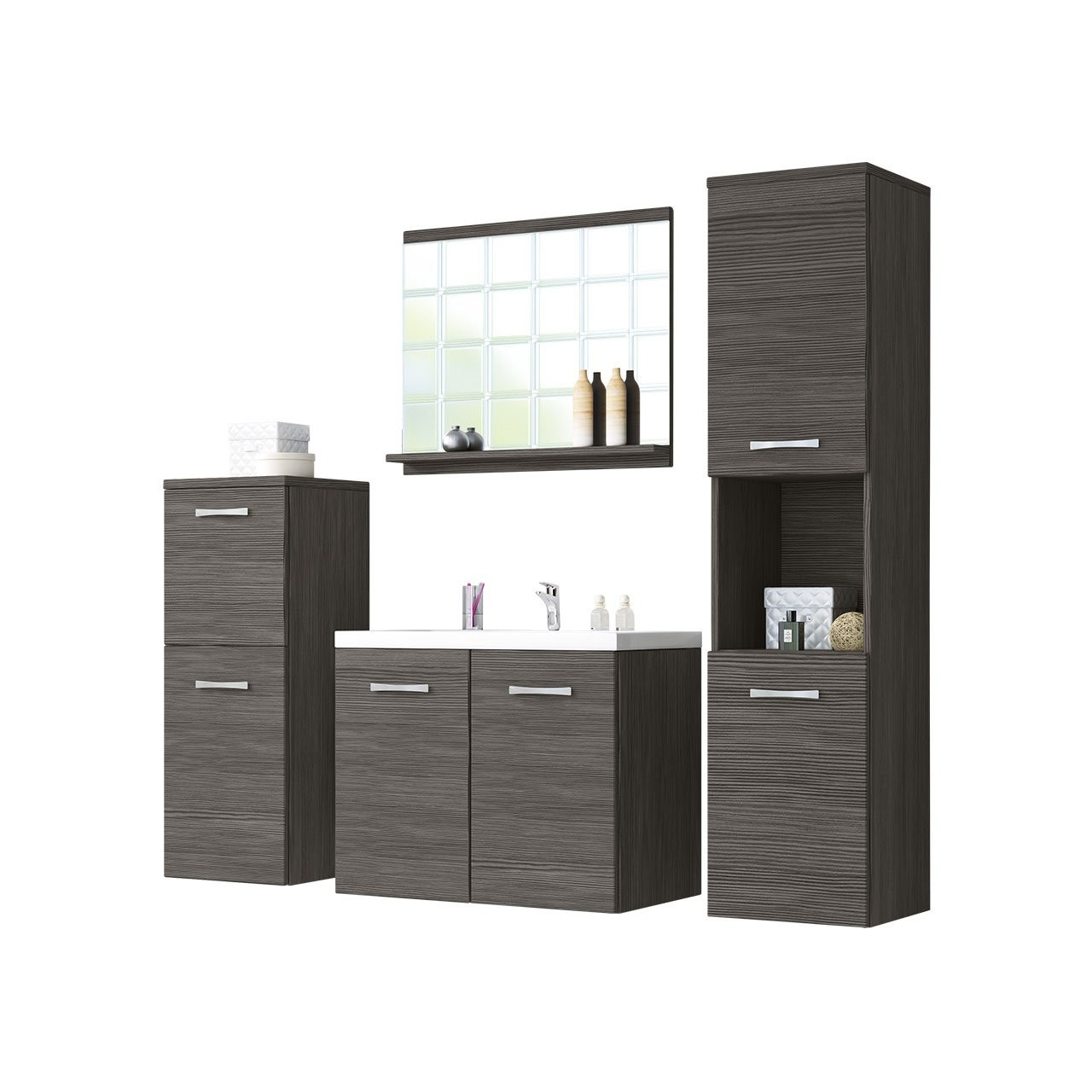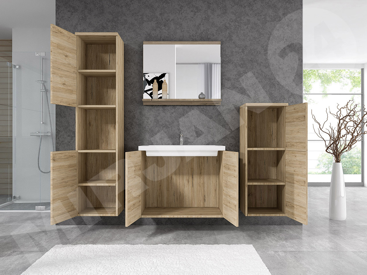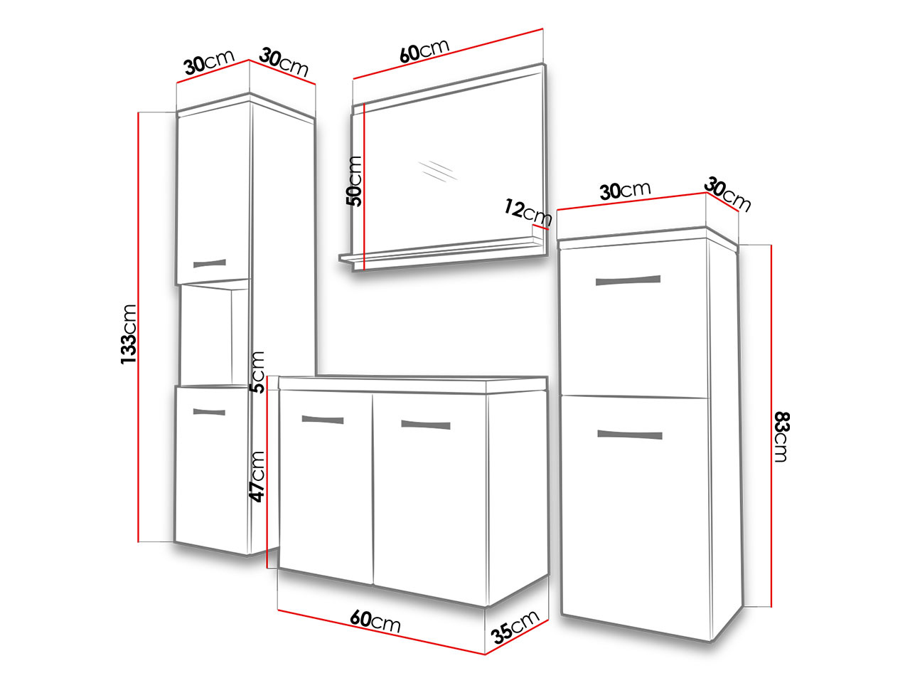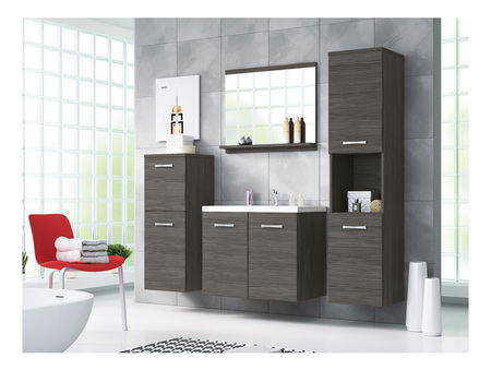 Kupaonski set je idealan izbor za one koji traže udobnost i stil. Kupaonski namještaj Megi I kreiran je s naglaskom na funkcionalnost i dobar izgled. Set sadrži ogledalo smješteno na ploči, ormarić ispod umivaonika, umivaonik i dva ormarića. Ogledalo sadrži policu. Namještaj je dostupan u širokom rasponu boja i ima elegantne ručke. Set se sastoji od elemenata: Veliki zidni ormarić 005: širina: 30 cm, visina: 133 cm, dubina: 30 cm. Ogledalo s policom 030: širina: 60 cm, visina: 50 cm, dubina: 12 cm. Ormarić ispod umivaonika 010: širina: 60 cm, visina: 47 cm, dubina: 35 cm. Zidni ormarić srednji 015: širina: 30 cm, visina: 83 cm, dubina: 30 cm. Umivaonik 060: širina: 60 cm, visina: 5 cm, dubina: 35 cm. Izvedba: korpus i fronte: mat laminirana ploča, ormarići su zidni. Sifon – uz nadoplatu. Jamstvo: 24 mjeseca.