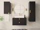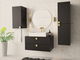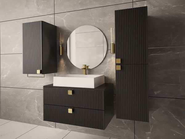Kupaonski set je idealan izbor za one koji traže udobnost i stil. S kupaonskim namještajem Petralio I uredite prekrasnu i praktičnu kupaonicu u glamour stilu. Zahvaljujući uzdužnom freziranju na frontama, namještaj dobiva originalan izgled. Zlatni elementi dodatak su koji namještaju daju eleganciju i jedinstven stil. Moderan kupaonski namještaj nije samo dizajnersko, već i funkcionalno rješenje. Unutrašnjost prostranih ormarića omogućuje vam spremanje potrebnih dodataka, kozmetike ili kućanskih potrepština. Kupaonski namještaj je funkcionalan, estetski i elegantan, što ga čini idealnim rješenjem za svaku ukusno uređenu kupaonicu. Dimenzije: Ormarić ispod umivaonika: širina: 80 cm, visina: 42 cm, dubina: 46 cm. Viseći ormarić: širina: 35 cm, visina: 120 cm, dubina: 35 cm. Viseći ormarić: širina: 35 cm, visina: 78 cm, dubina: 35 cm. Umivaonik 550x420x115: širina: 55 cm, visina: 12 cm, dubina: 42 cm. Izvedba: korpus: laminirana ploča debljine 16 mm, fronte: MDF ploča debljine 18 mm, rubovi završeni PVC furnirom, ručka: plastični gumb u zlatnoj boji, hidraulične šarke, kuglične vodilice. Umivaonik uz nadoplatu, sifon uz nadoplatu, ogledalo nije uključeno u set. Mogućnost kupnje iz naše ponude. Nema zidnih montažnih elemenata (letve i tiple) za viseće ormariće 02 i 03 – kupac ih mora kupiti zasebno. Jamstvo: 24 mjeseca.