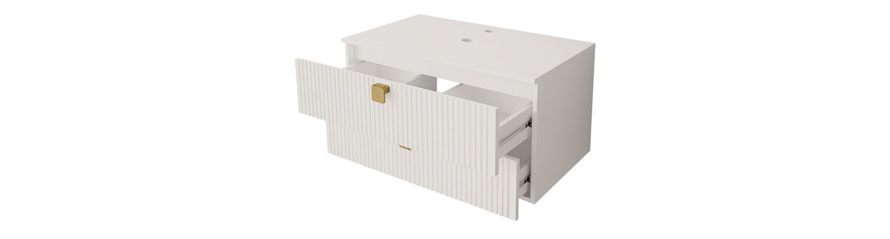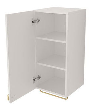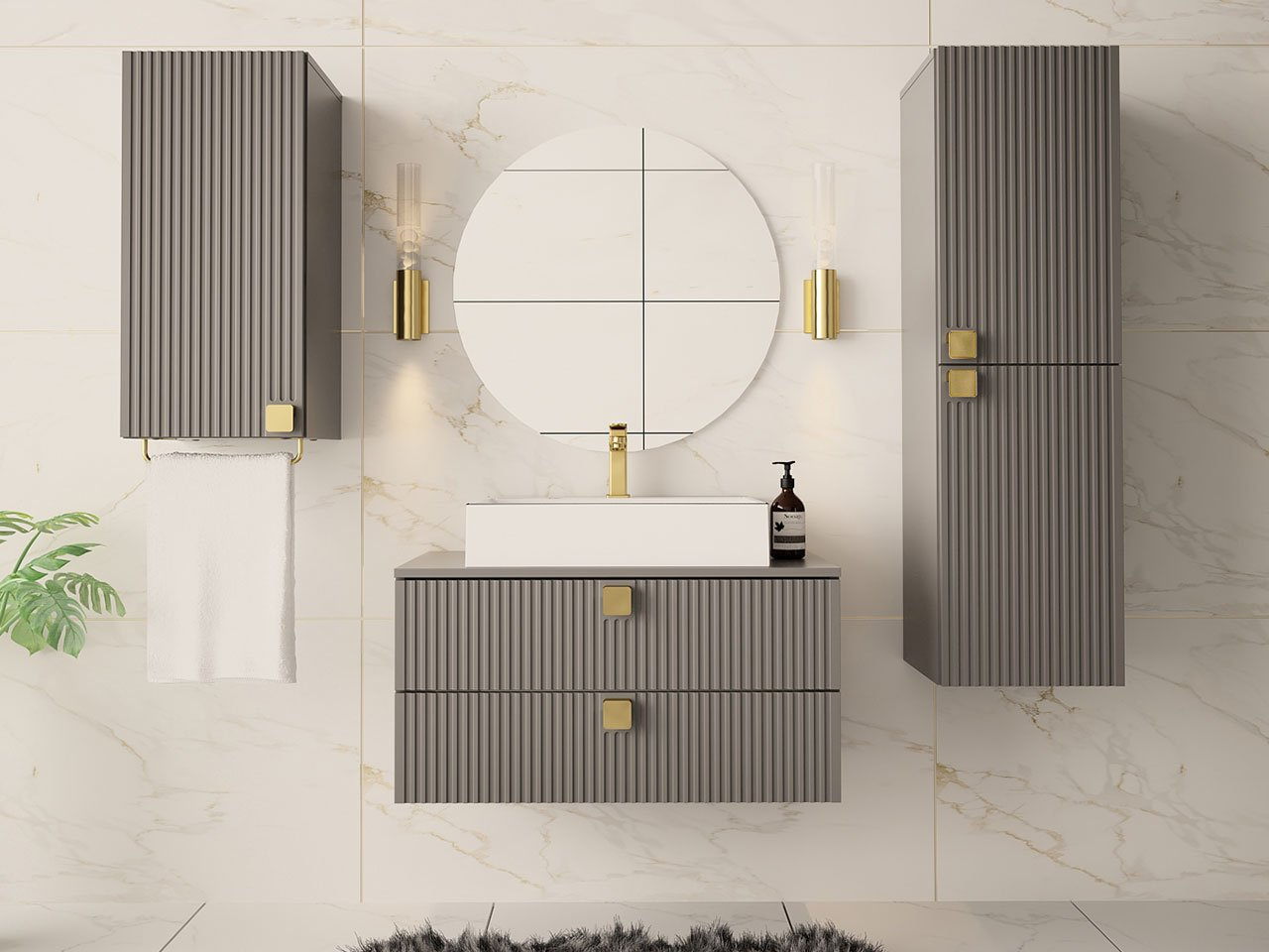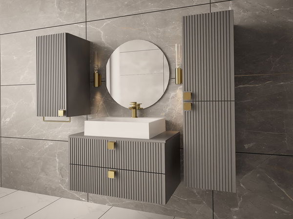 Kupaonski set je idealan izbor za one koji traže udobnost i stil. S kupaonskim namještajem Petralio I uredite prekrasnu i praktičnu kupaonicu u glamour stilu. Zahvaljujući uzdužnom freziranju na frontama, namještaj dobiva originalan izgled. Zlatni elementi dodatak su koji namještaju daju eleganciju i jedinstven stil. Moderan kupaonski namještaj nije samo dizajnersko, već i funkcionalno rješenje. Unutrašnjost prostranih ormarića omogućuje vam spremanje potrebnih dodataka, kozmetike ili kućanskih potrepština. Kupaonski namještaj je funkcionalan, estetski i elegantan, što ga čini idealnim rješenjem za svaku ukusno uređenu kupaonicu. Dimenzije: Ormarić ispod umivaonika: širina: 80 cm, visina: 42 cm, dubina: 46 cm. Viseći ormarić: širina: 35 cm, visina: 120 cm, dubina: 35 cm. Viseći ormarić: širina: 35 cm, visina: 78 cm, dubina: 35 cm. Umivaonik 550x420x115: širina: 55 cm, visina: 12 cm, dubina: 42 cm. Izvedba: korpus: laminirana ploča debljine 16 mm, fronte: MDF ploča debljine 18 mm, rubovi završeni PVC furnirom, ručka: plastični gumb u zlatnoj boji, hidraulične šarke, kuglične vodilice. Umivaonik uz nadoplatu, sifon uz nadoplatu, ogledalo nije uključeno u set. Mogućnost kupnje iz naše ponude. Nema zidnih montažnih elemenata (letve i tiple) za viseće ormariće 02 i 03 – kupac ih mora kupiti zasebno. Jamstvo: 24 mjeseca.