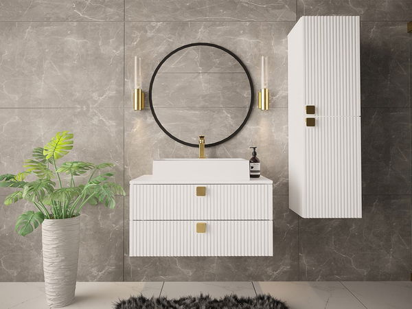 PrikazKupaonski set idealan je izbor za one koji traže udobnost i stil. Recept za lijep i praktičan interijer je kupaonski namještaj Petralio III. Savršen za svaki prostor. Sastoji se od visećih elemenata koji štede prostor na podu i olakšavaju svakodnevno čišćenje. Funkcionalnost povećavaju pregledne police i ladice, potrebne za kozmetiku i razne dodatke. Kombinacija ručki u zlatnoj boji s dekorativnim urezima na fronti daje izuzetan vizualni efekt. Viseći ormarić, kao i onaj ispod slavine za umivaonik, imaju puno prostora za pohranu. Uz set je moguće kupiti i sifon i slavinu za umivaonik. Predstavljeni kupaonski namještaj promijenit će vaš interijer i dodati mu ekskluzivan karakter. Dimenzije: ormarić ispod slavine za umivaonik: širina: 80 cm, visina: 42 cm, dubina: 46 cm. Viseći ormarić: širina: 35 cm, visina: 120 cm, dubina: 35 cm. Umivaonik 550x420x115: širina: 55 cm, visina: 12 cm, dubina: 42 cm. Izvedba: korpus – laminirana ploča debljine 16 mm, fronte – MDF ploča debljine 18 mm, rubovi završeni PVC furnirom, ručka: plastični gumb u zlatnoj boji, hidraulične šarke, kuglične vodilice, umivaonik uz nadoplatu, sifon uz nadoplatu, ogledalo nije uključeno u set (moguće kupiti u našoj ponudi), zidni montažni elementi (letve i tiple) za ormariće 02 i 03 nisu uključeni – kupac ih mora kupiti zasebno. Jamstvo: 24 mjeseca.
