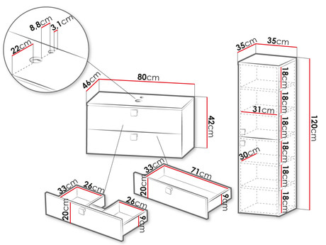 Kupaonski set idealan je izbor za one koji traže udobnost i stil. Recept za lijep i praktičan interijer je kupaonski namještaj Petralio III. Savršen za svaki prostor. Sastoji se od visećih elemenata koji štede prostor na podu i olakšavaju svakodnevno čišćenje. Funkcionalnost povećavaju pregledne police i ladice, potrebne za kozmetiku i razne dodatke. Kombinacija ručki u zlatnoj boji s dekorativnim urezima na fronti daje izuzetan vizualni efekt. Viseći ormarić, kao i onaj ispod slavine za umivaonik, imaju puno prostora za pohranu. Uz set je moguće kupiti i sifon i slavinu za umivaonik. Predstavljeni kupaonski namještaj promijenit će vaš interijer i dodati mu ekskluzivan karakter. Dimenzije: ormarić ispod slavine za umivaonik: širina: 80 cm, visina: 42 cm, dubina: 46 cm. Viseći ormarić: širina: 35 cm, visina: 120 cm, dubina: 35 cm. Umivaonik 550x420x115: širina: 55 cm, visina: 12 cm, dubina: 42 cm. Izvedba: korpus – laminirana ploča debljine 16 mm, fronte – MDF ploča debljine 18 mm, rubovi završeni PVC furnirom, ručka: plastični gumb u zlatnoj boji, hidraulične šarke, kuglične vodilice, umivaonik uz nadoplatu, sifon uz nadoplatu, ogledalo nije uključeno u set (moguće kupiti u našoj ponudi), zidni montažni elementi (letve i tiple) za ormariće 02 i 03 nisu uključeni – kupac ih mora kupiti zasebno. Jamstvo: 24 mjeseca.