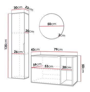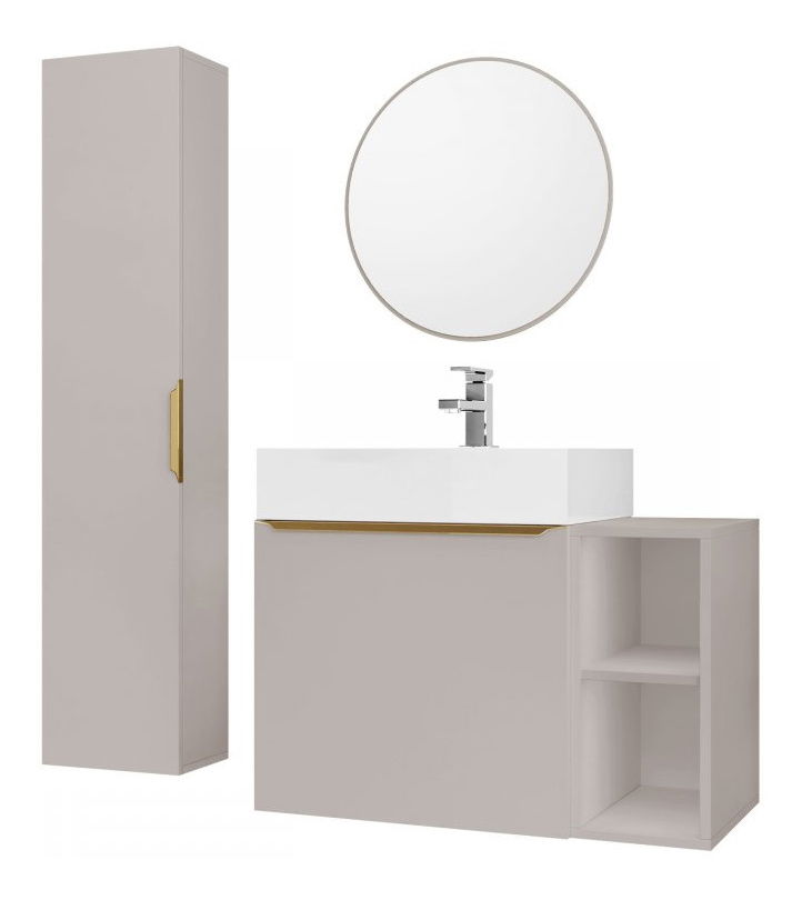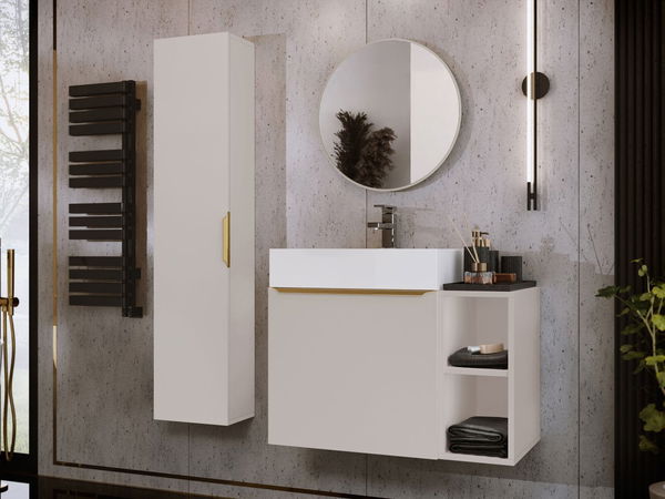 Kupaonski set idealan je izbor za one koji traže udobnost i stil. Osmislite praktičan prostor za svakodnevnu njegu. Kupaonski namještaj Setorio I kombinira više funkcionalnih elemenata. Set nudi dovoljno prostora za kozmetiku, ručnike i sredstva za čišćenje. Dio kompleta je i praktično ogledalo. Setorio je zidni kupaonski namještaj koji će izgledati odlično i u malom prostoru. Sjajne boje i zlatni detalji unose luksuzan karakter u svaki interijer. Set sadrži ormarić s umivaonikom, zidni ormarić i ogledalo. Uz nadoplatu dostupni su i umivaonik i sifon. Dimenzije: ormarić s umivaonikom Setorio: širina: 79 cm, visina: 50 cm, dubina: 43 cm. Zidni ormarić Setorio: širina: 30 cm, visina: 135 cm, dubina: 23 cm. Umivaonik 550x420x115: širina: 55 cm, visina: 12 cm, dubina: 42 cm. Ogledalo Setorio: širina: 50 cm, visina: 50 cm, dubina: 2 cm. Izvedba: korpus i fronte od 16 mm laminirane ploče, ABS rub debljine 0,5 mm, stražnji dio od HDF ploče, GTV panti, metalne zlatne ručke, ogledalo debljine 3 mm, umivaonik uz nadoplatu, sifon uz nadoplatu, slavina za umivaonik prikazana na fotografiji nisu uključene u cijenu. Jamstvo: 24 mjeseca.