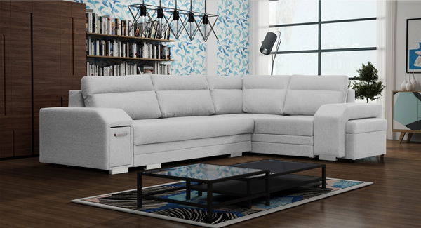 Kutna garnitura Alfredo ima u jednom naslonu sakriven minibar. Može se razvući i ima 2 prostora za odlaganje.