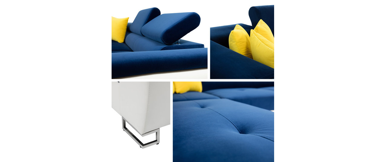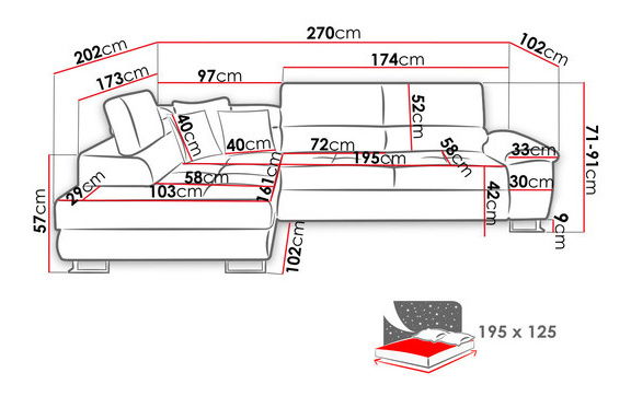 Kutna garnitura na razvlačenje idealan je izbor za one koji traže udobnost i stil. Alvin Premium je komad namještaja koji pruža savršene uvjete za opuštanje s obitelji, zajedničko gledanje filmova ili popodnevni odmor. Povišeni standard izrade osiguravaju prvenstveno kvalitetne komponente zahvaljujući kojima je sjedalo iznimno mekano i udobno. Podesivi nasloni za glavu omogućuju personalizaciju – njihovo podešavanje možete prilagoditi obliku tijela, čime se osigurava zdrav i udoban odmor. Dodatna prednost koja izdvaja ovu garnituru je funkcija razvlačenja. Nakon razvlačenja, namještaj nudi prostranu površinu, idealnu za redovito spavanje ili povremeno prenoćište gostiju. Spremnik ispod sjedala pomoći će vam u pohrani posteljine. Moderna kutna garnitura Alvin dostupna je u mnogim jedinstvenim izvedbama. Posebnu pažnju zaslužuju estetske kvalitete poput modernih boja i zanimljivih uzoraka. Ono što ih razlikuje od drugih materijala su praktična i korisna svojstva. Dimenzije: duljina: 270 cm, širina: 202 cm, visina: 71–91 cm, površina za spavanje: 195 x 125 cm. Dimenzije spremnika: duljina: 174 cm, širina: 92 cm, visina: 18 cm. Izvedba: konstrukcija sjedala: drveni okvir + opruga + filc + T-2844 pjena debljine 9 cm, sjedalo je vrlo mekano i udobno što jamči udobnost na najvišoj razini, konstrukcija naslona: drveni okvir + vlaknasta ploča + T-2844 pjena debljine 7 cm + val opruga, garnitura je na razvlačenje – može se koristiti za spavanje, kut tipa L, spremnik za posteljinu, podesivi nasloni za glavu, uključeni jastuci (3 mala) – sa zatvaračem, fiksno tapecirani nasloni, plastične stražnje noge – prednje kromirane metalne. Jamstvo: 24 mjeseca.