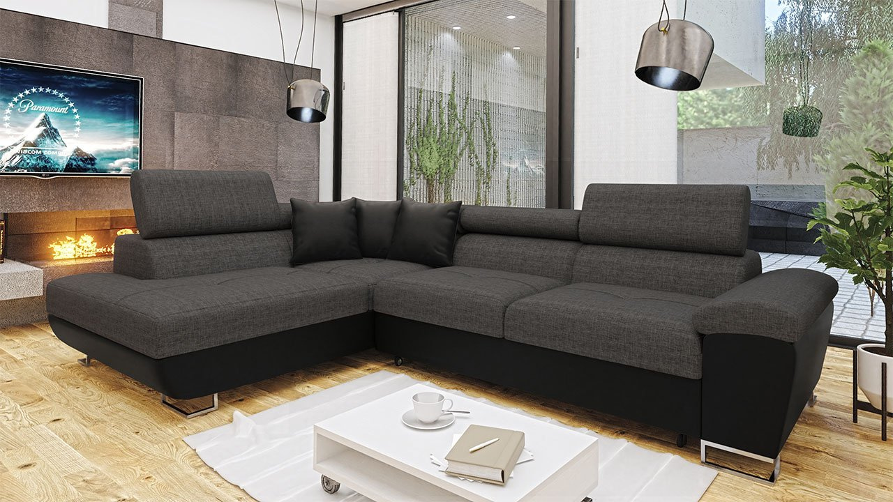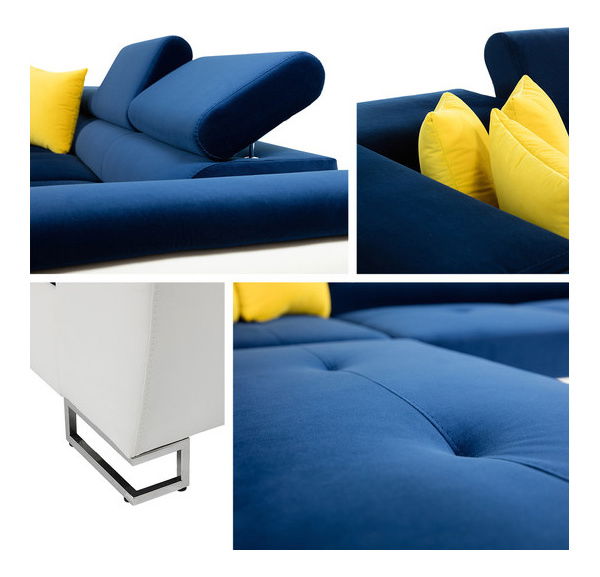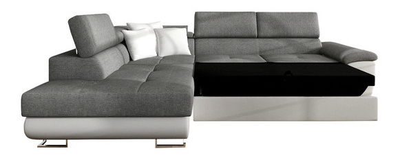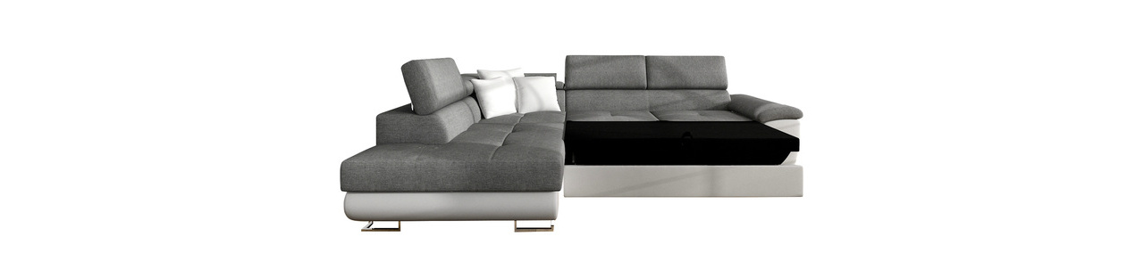Kutna garnitura za dnevni boravak idealan je izbor za one koji traže udobnost i stil. Kutna garnitura Alvin Sale unijet će u vaš dnevni boravak udobnost i nesumnjivu praktičnost. Za te karakteristike zaslužna je nova generacija pjene – T-2844, zahvaljujući kojoj je sjedalo mekano i SUPER UDOBNO! Pjena se savršeno prilagođava korisniku, obavija ga svojom mekoćom i nježnošću, pružajući potpunu regeneraciju i opuštanje. Sličnu mekoću i udobnost nećete doživjeti ni na jednoj drugoj kutnoj garnituri! Kutna garnitura Alvin Sale dostupna je u dvije kombinacije boja. Sjedalo i naslon izrađeni su od izuzetno izdržljive LUX tkanine. Odlikuje se visokom otpornošću na mrlje i blijeđenje. Vrijedi spomenuti i moderan dizajn namještaja. To je zahvaljujući jednostavnom obliku sjedala, minimalističkom prošivanju i dizajnerskim nogama u kromiranom izdanju. Još jedna prednost ove kutne garniture su podesivi nasloni za glavu. Zahvaljujući njima možete rasteretiti vratni dio. Model ima i funkciju spavanja te spremnik za posteljinu. Dimenzije: duljina: 270 cm, širina: 202 cm, visina: 71 – 91 cm, površina za spavanje: 195 x 125 cm, dimenzije spremnika: duljina: 174 cm, širina: 92 cm, visina: 18 cm. Strana kuta: lijeva ili desna. Izvedba: konstrukcija sjedala: drveni okvir + val opruga + filc + 9 cm pjena T-2844 + vata, *sjedalo je vrlo mekano i udobno, pa pruža odmor na najvišoj razini, konstrukcija naslona: drveni okvir + vlaknasta ploča + 7 cm pjena T-2844 + vata, kutna garnitura je razvlačiva, ima funkciju spavanja, kut L oblika, spremnik za posteljinu, podesivi nasloni za glavu, jastuci uključeni (3 mala) – na zatvarač, tapecirani fiksni naslon, stražnje noge plastične – prednje kromirane metalne, slobodnostojeća kutna garnitura (stražnji dio presvučen tkaninom). Jamstvo: 24 mjeseca.