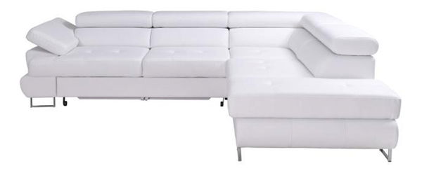 Moderna kutna garnitura u bijeloj eko-koži. Ima podesiva uzglavlja, a sjedište ima dekorativan šav. Noge su metalne u boji kroma.