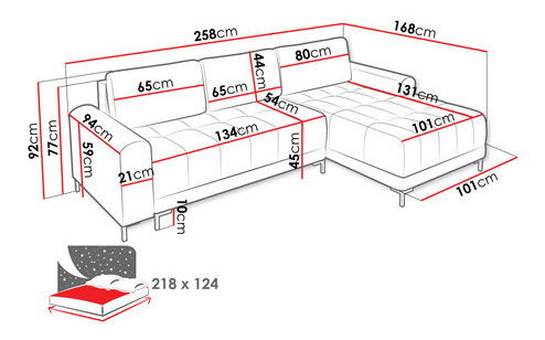 Kutna garnitura idealan je izbor za one koji traže udobnost i stil. Moderna kutna garnitura Bonezi L za dnevni boravak savršen je pratilac za vaše slobodno vrijeme. Možete se opustiti na prostranim sjedištima uz knjigu ili gledanje serija. Jastuci pružaju oslonac vašim leđima, a umorne noge možete podići na ležaljku. Ako želite kratko odrijemati ili koristiti garnituru za svakodnevno spavanje, jednostavno je razvucite. Produženjem sjedišta stvarate udobne uvjete za kvalitetan san. Moderna kutna garnitura u obliku slova L nudi i spremnik za posteljinu. Prostrana kutija olakšava odlaganje jastuka i pokrivača, a ima dovoljno mjesta i za rezervne deke za hladne jesenske večeri. Dimenzije: duljina: 258 cm, širina: 168 cm, visina: 92 cm, površina za spavanje: 218 x 124 cm. Dimenzije spremnika: duljina: 130 cm, širina: 62 cm, visina: 20 cm. Strana kuta: lijeva ili desna. Izvedba: konstrukcija – borovina + iverica 15 mm + laminirana ploča 15 mm, sjedište i naslon: pjena T2837, debljina 10 cm + val opruge „tip A“, kutna garnitura na razvlačenje, automatski mehanizam, funkcija spavanja, spremnik, noge: metal + crna plastika, naslon u obliku pomičnih jastuka, jastuci na zatvarač, punjeni usitnjenom pjenom, slobodnostojeća kutna garnitura (stražnja strana tapecirana tkaninom). Jamstvo: 24 mjeseca.