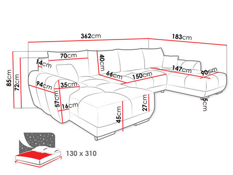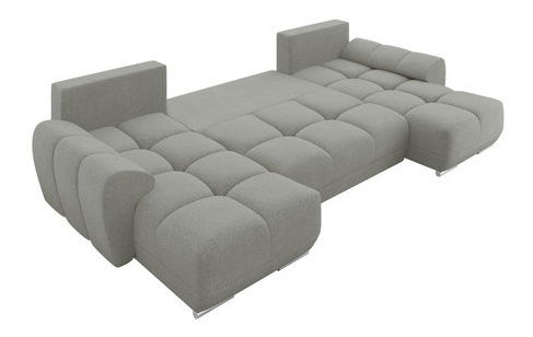 PrikazKutna garnitura idealan je izbor za one koji traže udobnost i stil. Obiteljska kutna garnitura u obliku U Bordia pruža savršene uvjete za zajednički odmor. Prostrana sjedala nude udobno mjesto za gledanje filmova i pregledavanje omiljenih stranica. Kada se udobno smjestite, možete osloniti leđa – udobnost jamče atraktivni jastuci. Garnitura na razvlačenje ima i funkciju spavanja. Produženjem središnjeg dijela sofe dobiva se prostrani ležaj. To je izvrsno rješenje kako za svakodnevno spavanje, tako i za povremene goste. Dodatna prednost je prostrani spremnik u koji stanu pokrivači, jastuci i dovoljno mjesta primjerice za dodatnu deku. Dimenzije: duljina: 362 cm, širina: 183 cm, visina: 85 cm, ležaj: 310 x 130 cm, dimenzije spremnika: duljina: 147 cm, širina: 60 cm, visina: 24 cm. Kut: simetričan. Izvedba: okvir – borovo drvo + iverica debljine 16 mm, sjedište i naslon: pjena T28 debljine 8 cm + val opruge, kutna garnitura na razvlačenje, automatski mehanizam tipa DL, funkcija spavanja, spremnik, plastične noge, naslon u obliku pomičnih jastuka punjenih pjenastim granulama, jastuci na patent, jastuci uključeni, slobodno stojeća kutna garnitura (leđa presvučena tkaninom). Jamstvo: 24 mjeseca.
