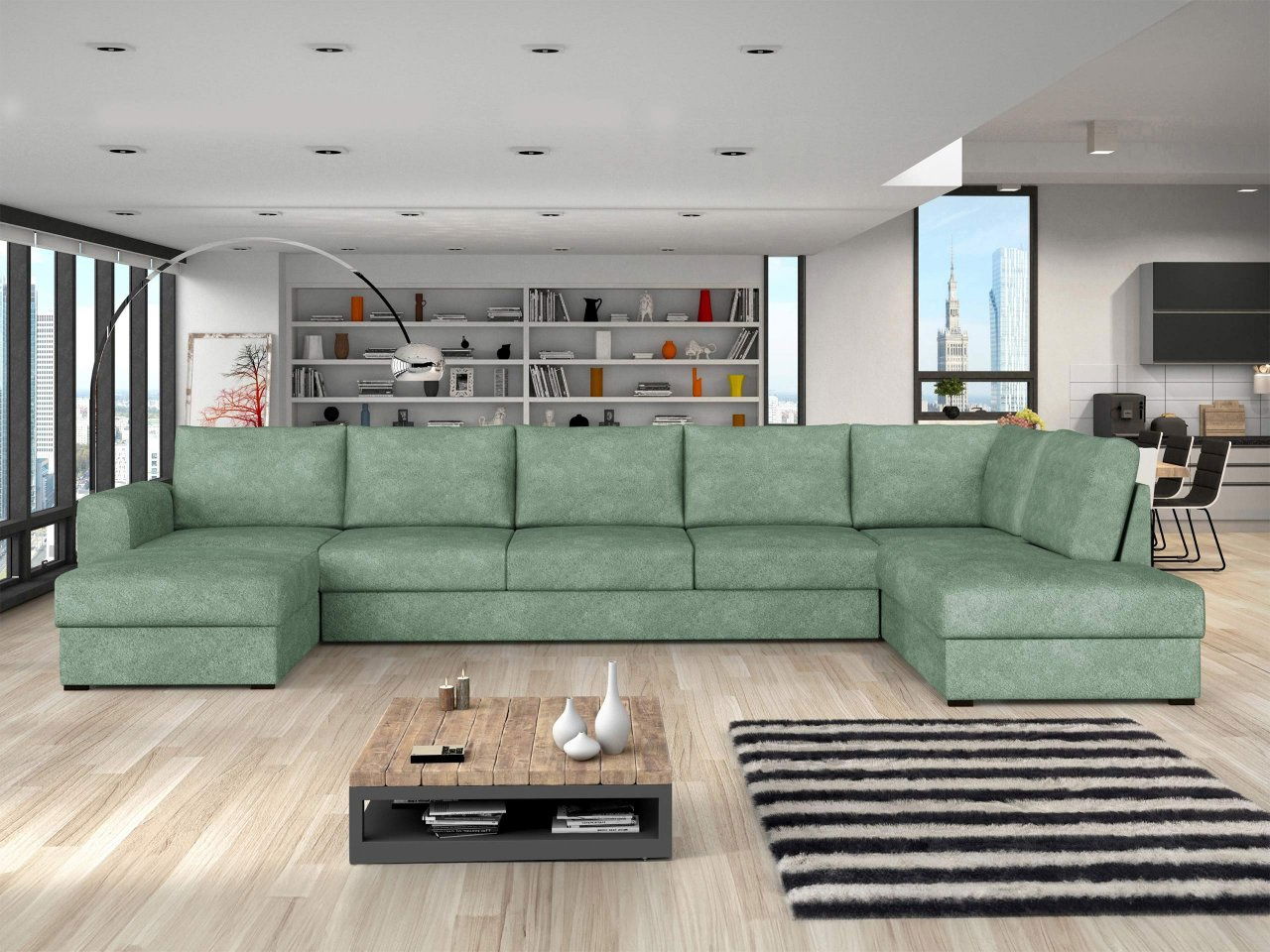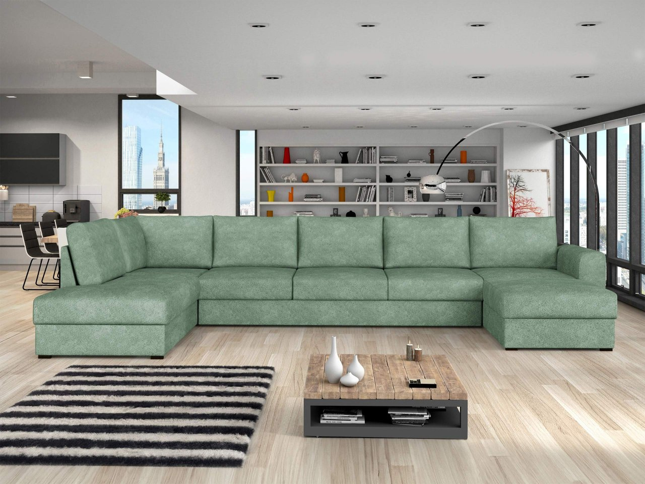 PrikazGarnitura je idealan izbor za one koji traže udobnost i stil. Ako ste jedan od sretnika s prostranim dnevnim boravkom, kutna garnitura Szafran kao stvorena je za vas! Pružit će vam ne samo mnogo prostora za sjedenje i odmor, nego se po potrebi može i rasklopiti te osigurati ležaj za spavanje. Garnitura ima funkciju na razvlačenje i prostrane spremnike koji su idealni za posteljinu i druge dodatke. Kutna garnitura ima oblik "U" i omogućuje jednostavniju komunikaciju osoba koje sjede jedna nasuprot drugoj. Još jedna prednost garniture Szafran Large je što je možete postaviti bilo gdje u prostoriji – riječ je o slobodno stojećem modelu čija je stražnja strana također tapecirana. Garnitura je izrađena od kvalitetnih i izdržljivih materijala koji jamče dugotrajnost i savršen izgled. Dimenzije: duljina: 370 cm, širina: 186 cm, visina: 85 cm, ležaj: 340 x 141 cm. Spremnici (2 kom): duljina: 180 cm, širina: 80 cm, visina: 21 cm i duljina: 150 cm, širina: 69 cm, visina: 21 cm. Strana: lijeva ili desna. Izvedba: sjedište – drveni okvir + val opruga + filc + pjena T2844 debljine 11 cm, naslon: drveni okvir + HDF ploča + pjena T2844 debljine 1 cm. Funkcija rasklapanja, funkcija spavanja, oblik U, dva spremnika za posteljinu, jastuci u cijeni (7 velikih) – s patentnim zatvaračem, naslon u obliku jastuka, drvene noge (tamni orah), slobodno stojeća garnitura (tapecirana tkaninom). Jamstvo: 24 mjeseca.