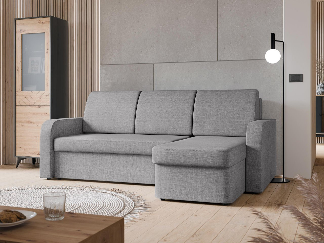 Kutna garnitura je idealan izbor za one koji traže udobnost i stil. Stil, udobnost i funkcionalnost tri su najvažnija aspekta kutne garniture na razvlačenje Ferulk. Brzo se pretvara u udoban krevet, idealan za posjet gostiju ili svakodnevni odmor. Dva spremnika za posteljinu pružaju prostor za sve potrebne predmete za relaksaciju. Uz nju vaša dnevna soba dobiva karakter! Jednostavan, moderan dizajn i univerzalna boja presvlake čine ovu kutnu garnituru odličnim rješenjem za svaki interijer. Meki leđni jastuci pružaju dodatnu udobnost. Kutna garnitura Ferulk brzo će postati omiljeno mjesto u vašem domu! Dimenzije: širina: 210 cm, dubina: 153 cm, visina: 85 cm, površina za spavanje: 195 x 120 cm, spremnici za posteljinu (dva komada): 123 x 60 x 27 cm, 61 x 21 x 26 cm. Kut: univerzalan (stranu bira kupac pri montaži). Izvedba: okvir: okvir od borovog drveta + ploča, sjedište i naslon: 10 cm debela pjena T28/44, kutna garnitura je na razvlačenje, ima funkciju spavanja, dva spremnika za posteljinu, PVC noge u crnoj boji, naslon u obliku pomičnih jastuka punjenih pjenom T18, jastuci s patentnim zatvaračem, jastuci uključeni, slobodnostojeća kutna garnitura (leđa presvučena tkaninom). Jamstvo: 24 mjeseca.