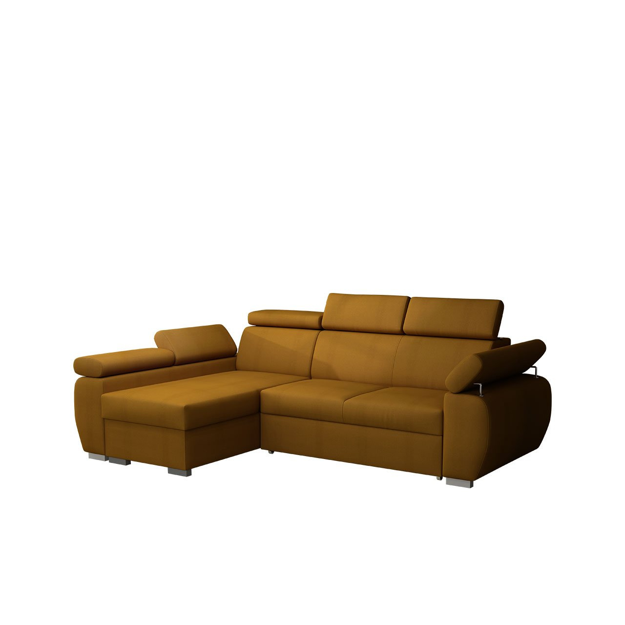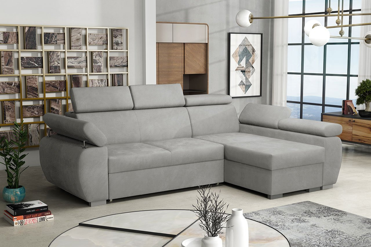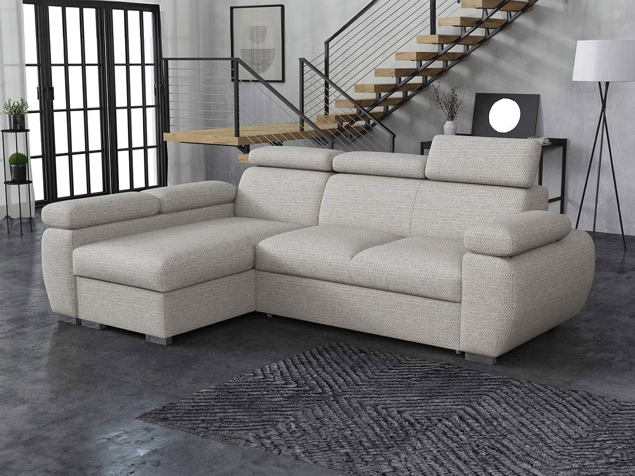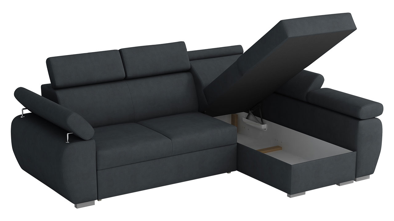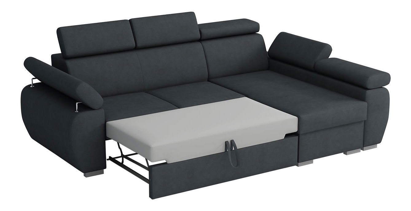 Kutna garnitura je idealan izbor za one koji traže udobnost i stil. Vaša udobnost tijekom opuštanja u dnevnoj sobi naš je prioritet. Zato smo za vas pripremili kutnu garnituru Giza Mini s prostorom za pohranu i podesivim naslonima za glavu za još veći komfor. Svaki naslon moguće je prilagoditi zasebno, čime se značajno podiže standard sjedenja i opuštanja. Zahvaljujući sustavu razvlačenja automat, garnitura se u trenu pretvara u ležaj optimalnih dimenzija za dvije osobe. Dimenzije: duljina: 255 cm, širina: 170 cm, visina: 85–100 cm, ležaj: 200 x 130 cm. Kutna strana: lijeva ili desna. Izvedba: okvir: 6 cm debelo borovo drvo + 16 mm iverica + 16 mm MDF ploča, naslon: T30/38 pjena, sjedalo: T30/38 pjena + valovita opruga tip B, nasloni za glavu: T23/15 pjena, funkcija razvlačenja automat, prostor za pohranu, kromirane metalne noge (već unaprijed montirane), podesivi nasloni za glavu, čvrsto pričvršćen tapecirani naslon, potpuno tapecirana garnitura pogodna i za smještaj u središtu prostorije. Dimenzije spremišta: duljina: 165 cm, širina: 62 cm, visina: 23 cm. Jamstvo: 24 mjeseca.