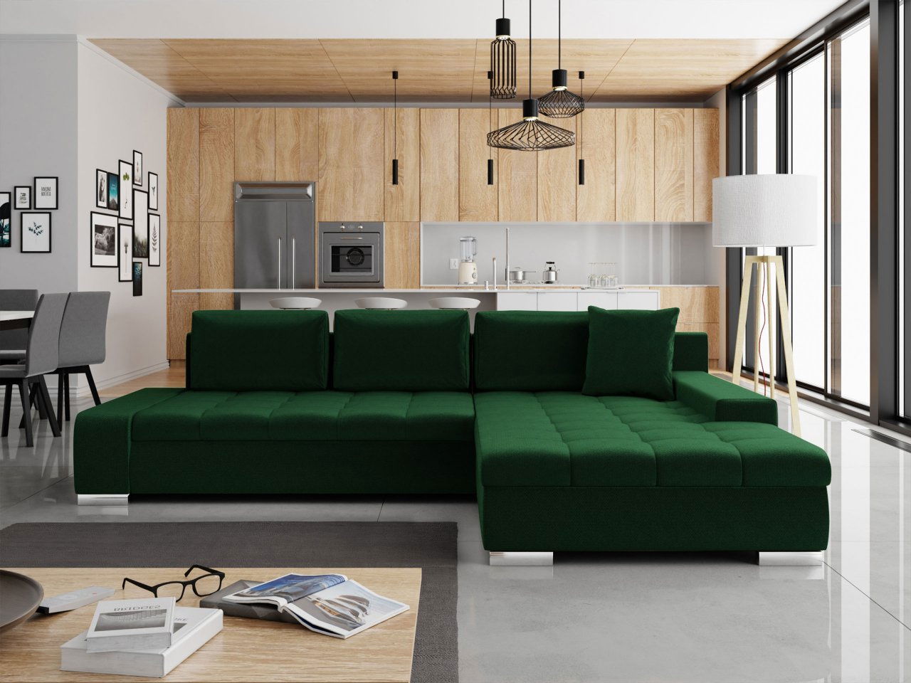 PrikazKutna garnitura je idealan izbor za one koji traže udobnost i stil. Sofa na razvlačenje Herkules prikladna je za velike prostorije. Garnitura je izrađena u obliku slova L, a njezine vanjske dimenzije su 302 cm x 213 cm. Zahvaljujući sustavu na razvlačenje, dio za sjedenje možete koristiti za spavanje – kada je rasklopljena, dimenzije ležaja su 252 cm x 140 cm. To je dovoljno za spavanje dviju osoba. Prostor za pohranu izrađen je ispod garniture, tako da imate lak pristup za odlaganje jastuka, deka ili posteljine. Sjedeći dio izrađen je od spiralnih opruga unutar konstrukcije, što produžuje trajnost pjene i omogućava veći komfor sjedenja. Kutna garnitura ispunjena je visokootpornom pjenom koja se savija samo na točki pritiska. HR pjena, za razliku od poliuretanskih, odlikuje se boljom prozračnošću i elastičnošću. To znači da se sjedište garniture Herkules "ne izsjedi", bolje se prilagođava tijelu i brže vraća u prvobitni oblik. Udobno se smjestite i priuštite si kutnu sofu na razvlačenje Herkules! Dimenzije: duljina: 302 cm, širina: 213 cm, visina: 80 cm, ležaj: 140 x 252 cm. Boja: odaberite varijantu ovdje. Izvedba kuta: univerzalna (strana se bira prilikom montaže). Dodatne informacije: prostor za pohranu: da, na razvlačenje: da, 3 velika + 1 mali jastuk s patentnim zatvaračem u cijeni, Potpuno tapecirano (tkanina i na stražnjoj strani), drvena konstrukcija + iverica, visokoelastična pjena, val opruge, prednje nogice: PVC (srebrne), stražnje nogice: PVC (crne). Jamstvo: 24 mjeseca.